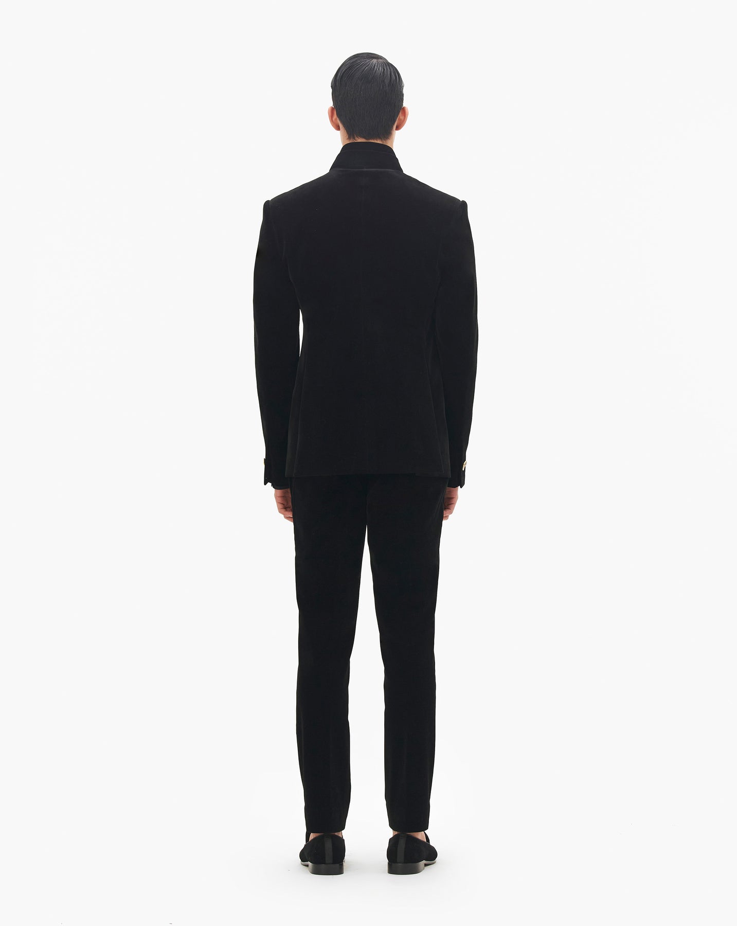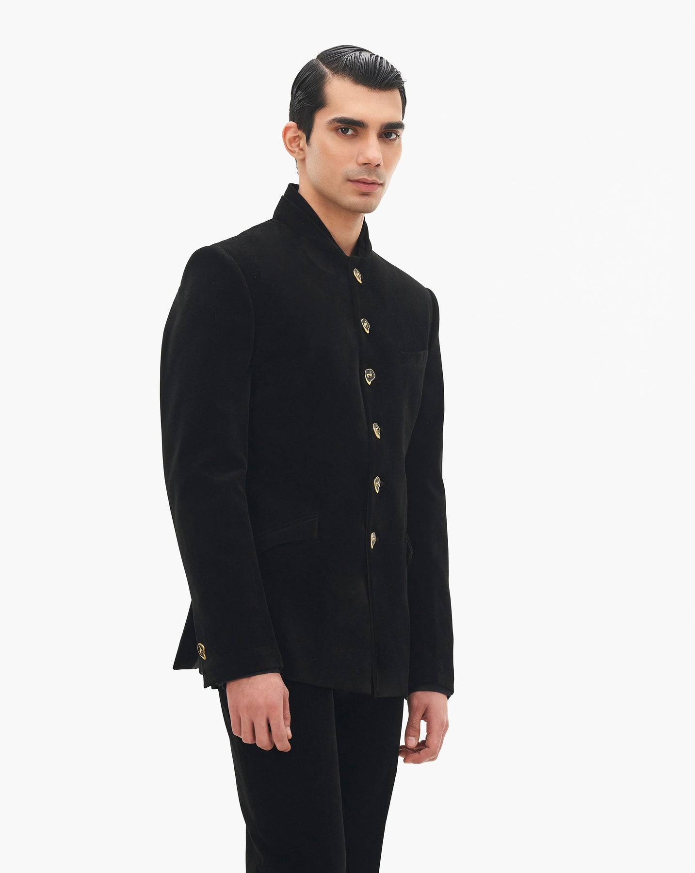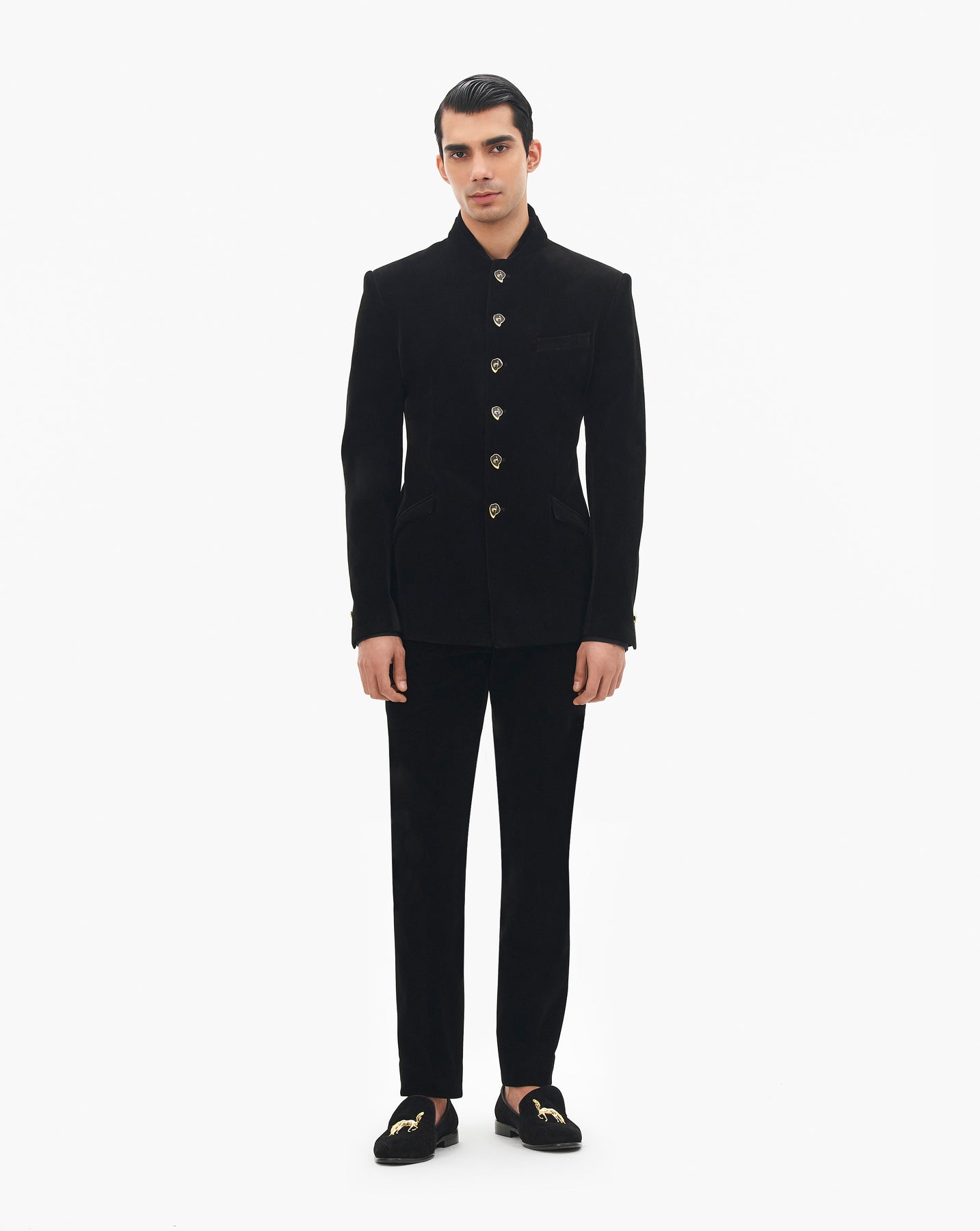 Classic black bandhgala tailored in plush velvet with full sleeves and house signature buttons.