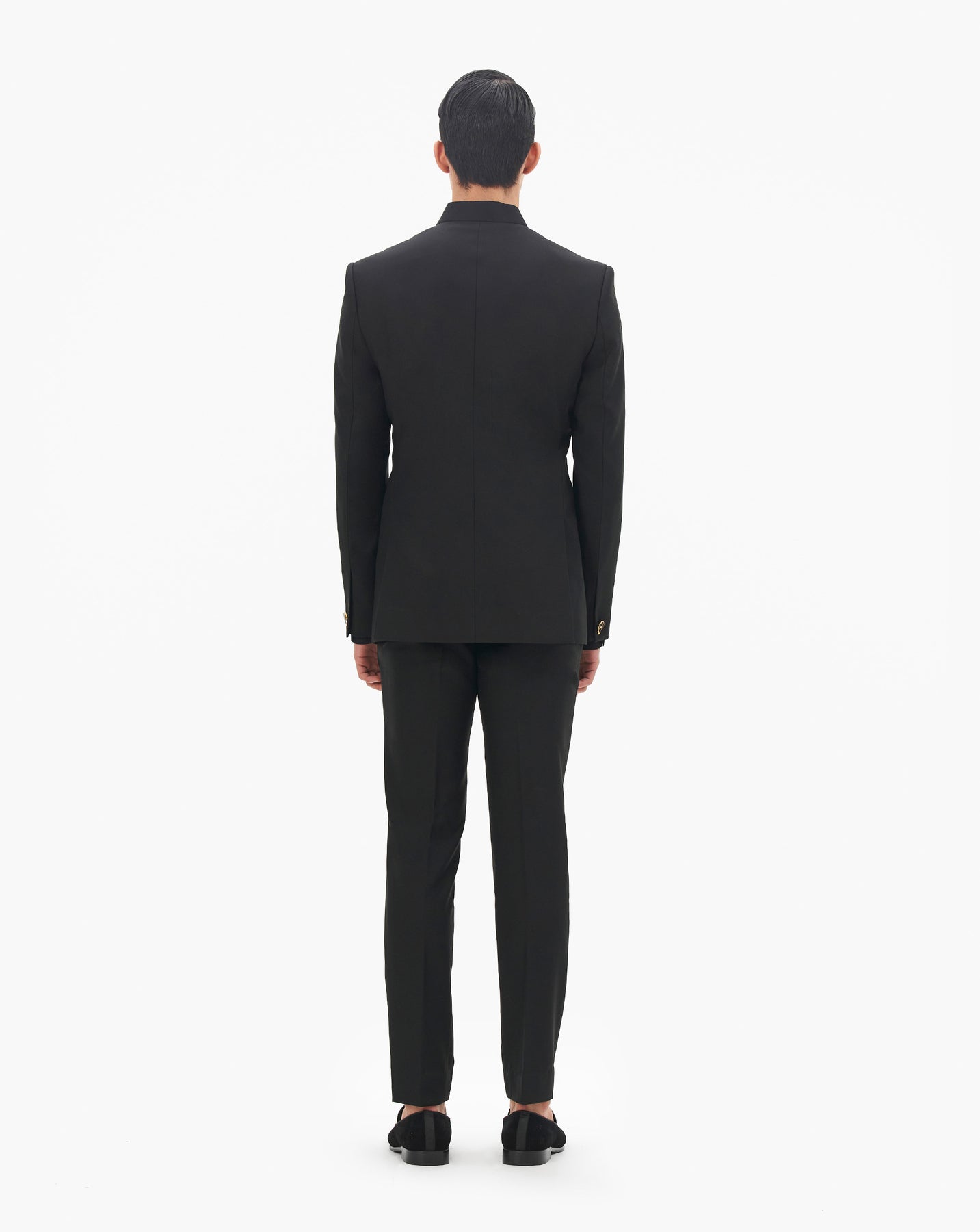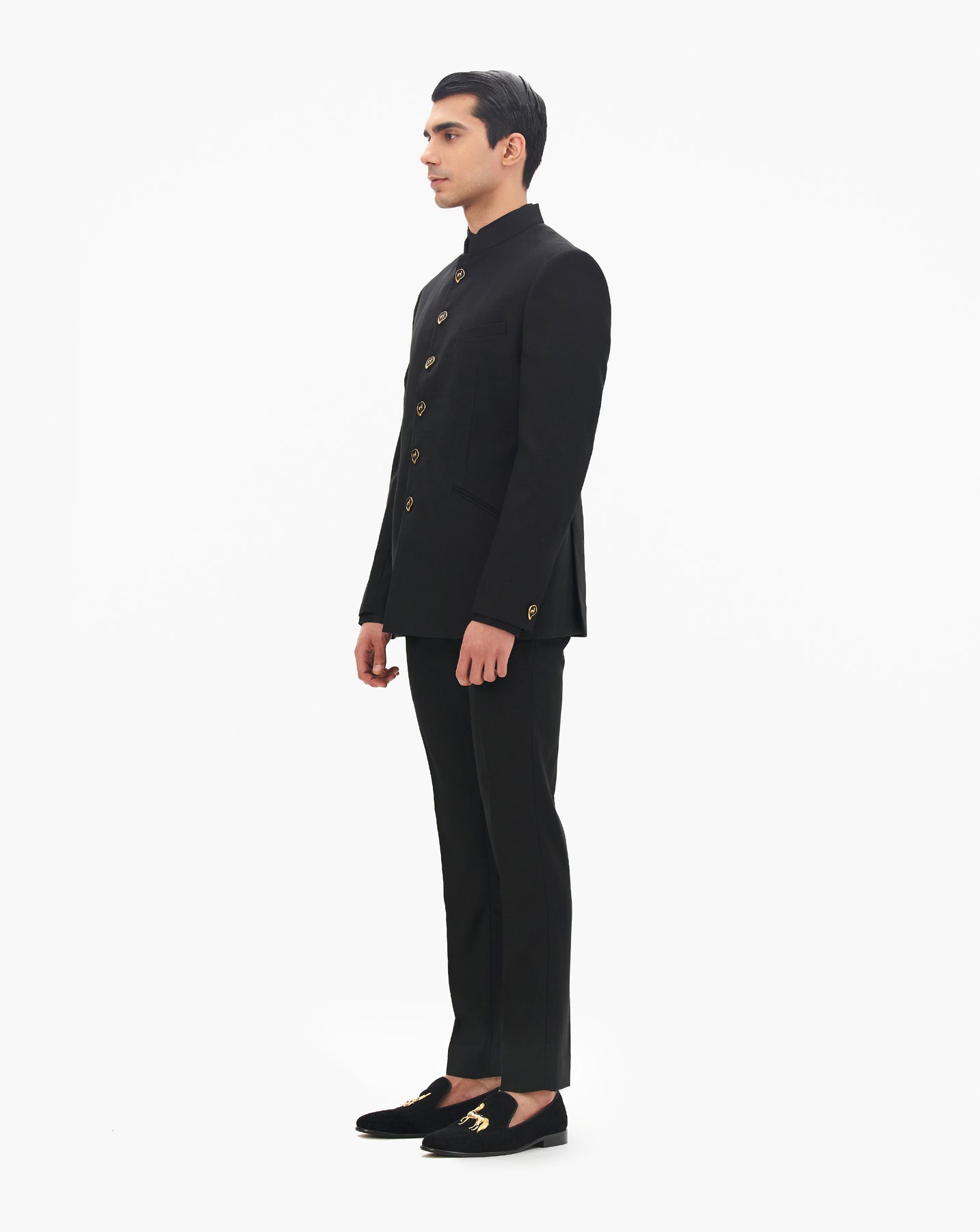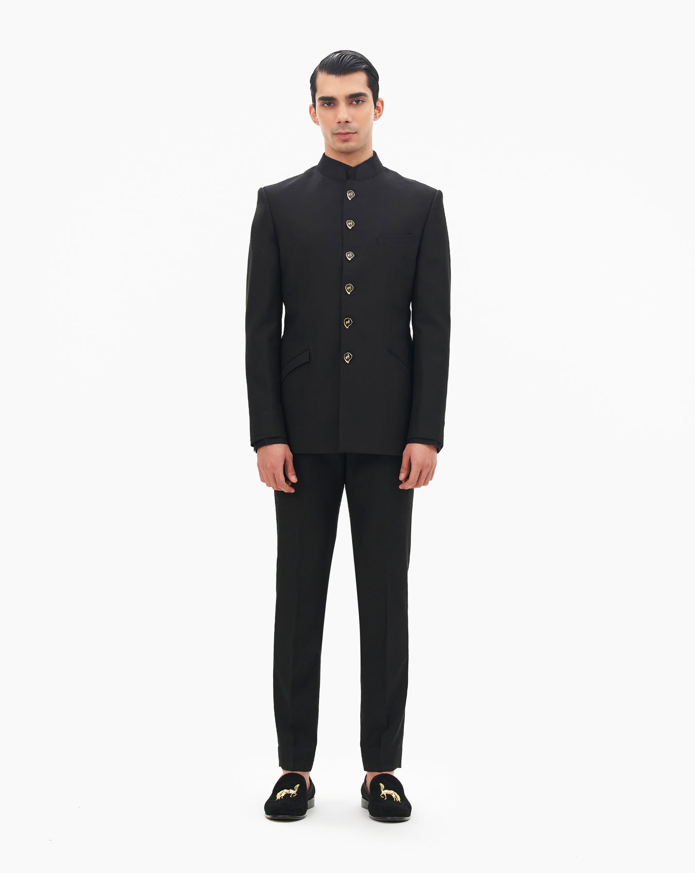 Cosmic black bandhgala tailored in plush velvet with full sleeves and house signtaure buttons.