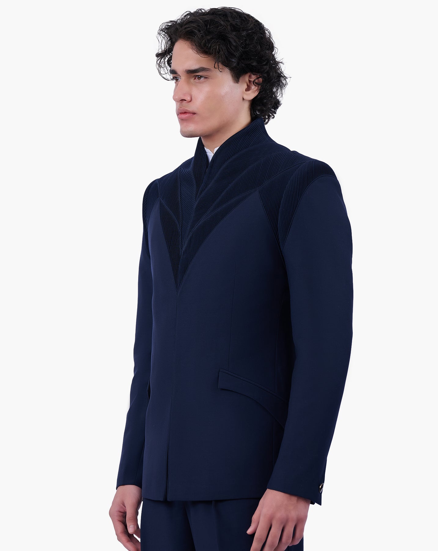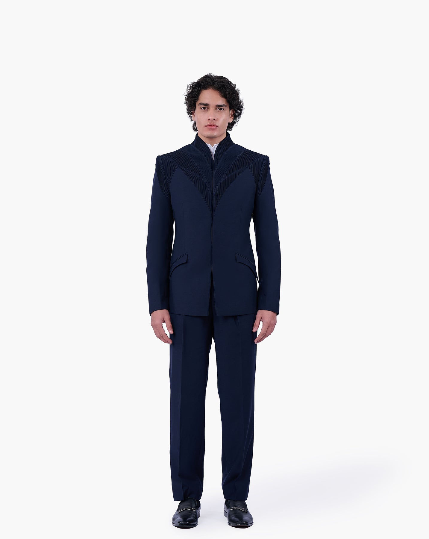 Space blue bandhgala featuring an architectural pintuck construction with a sculpted, structured silhouette and precise linear detailing.