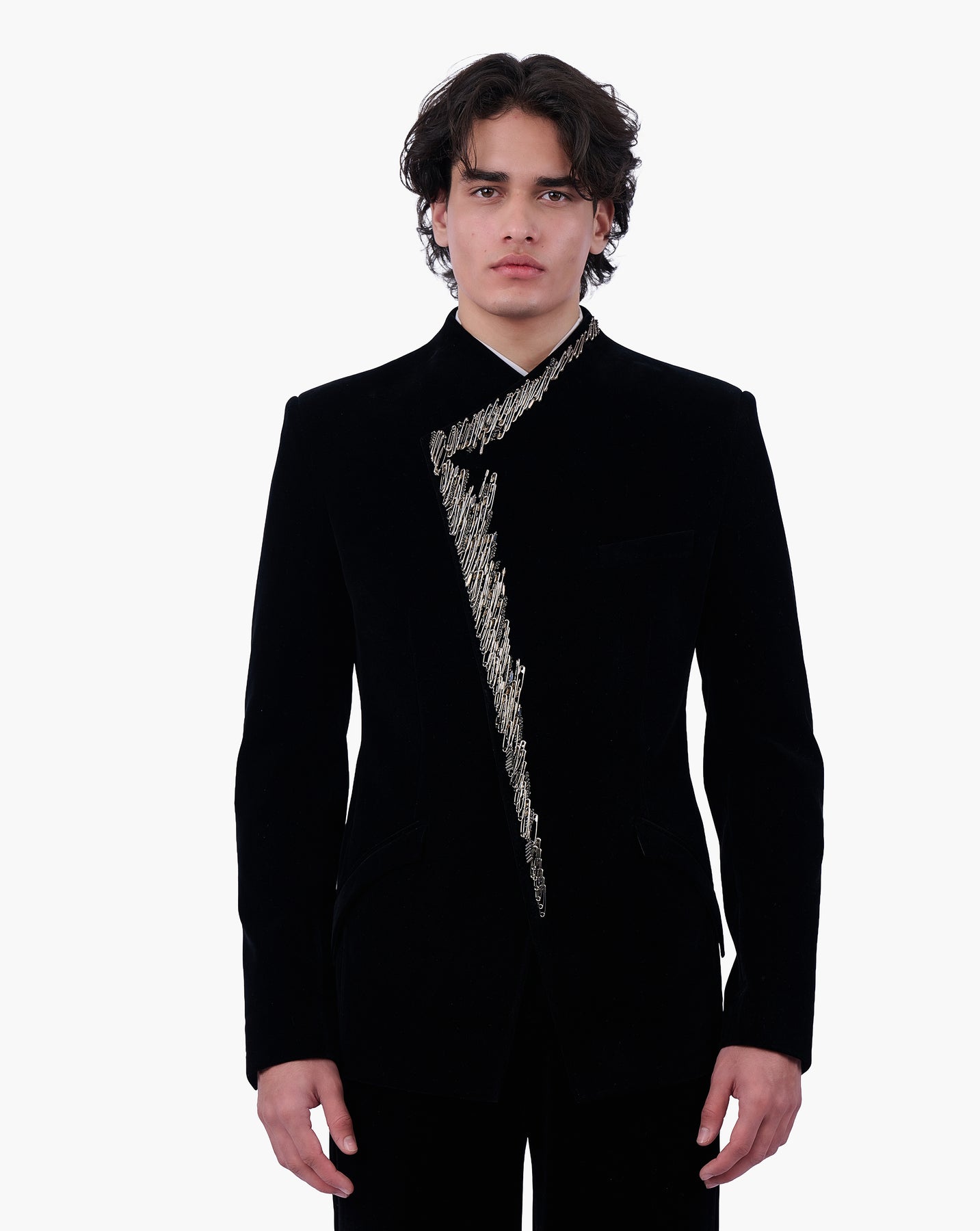 Black velvet bandhgala featuring an overlap front, finished with a signature safety pin motif adorned with crystal detailing