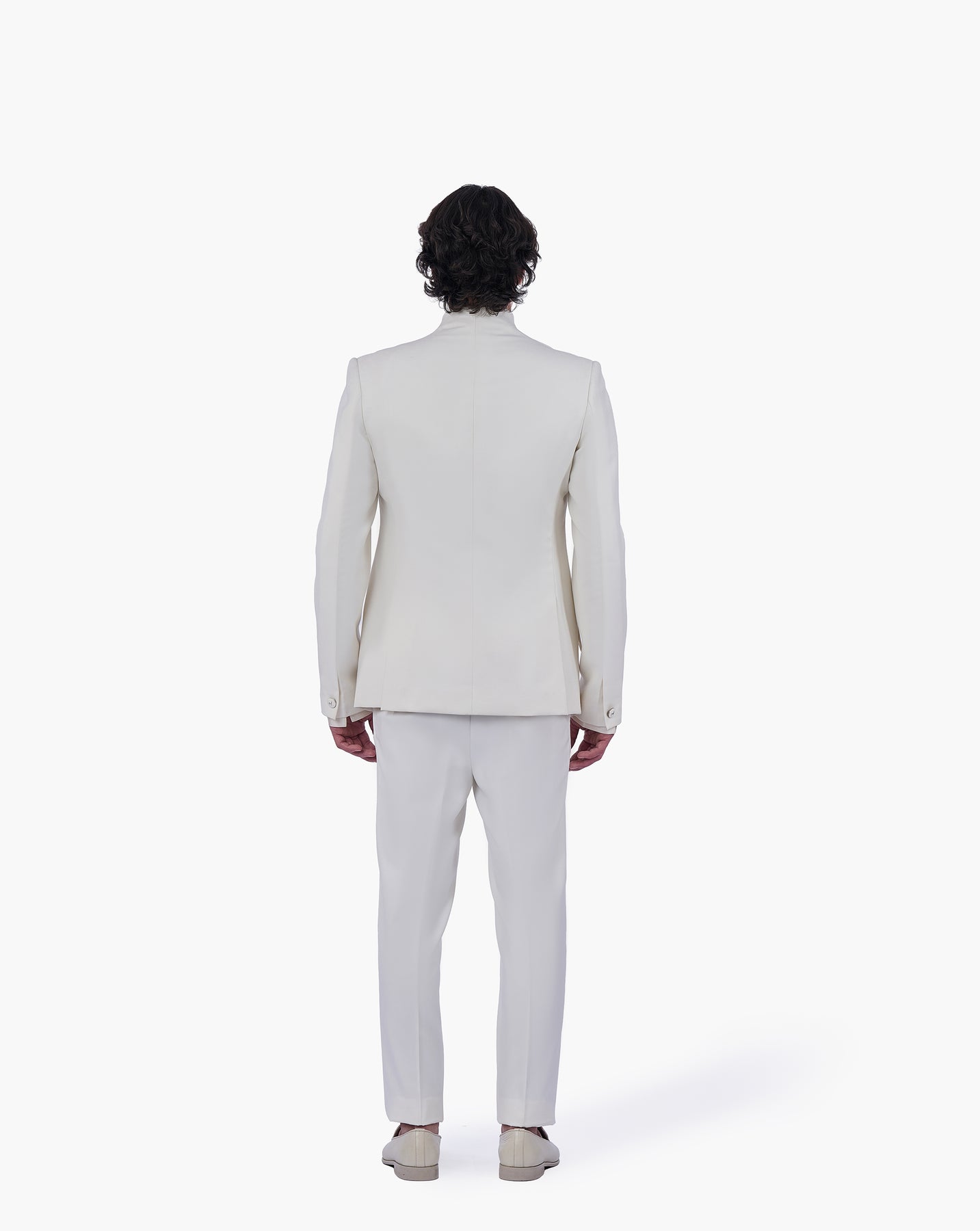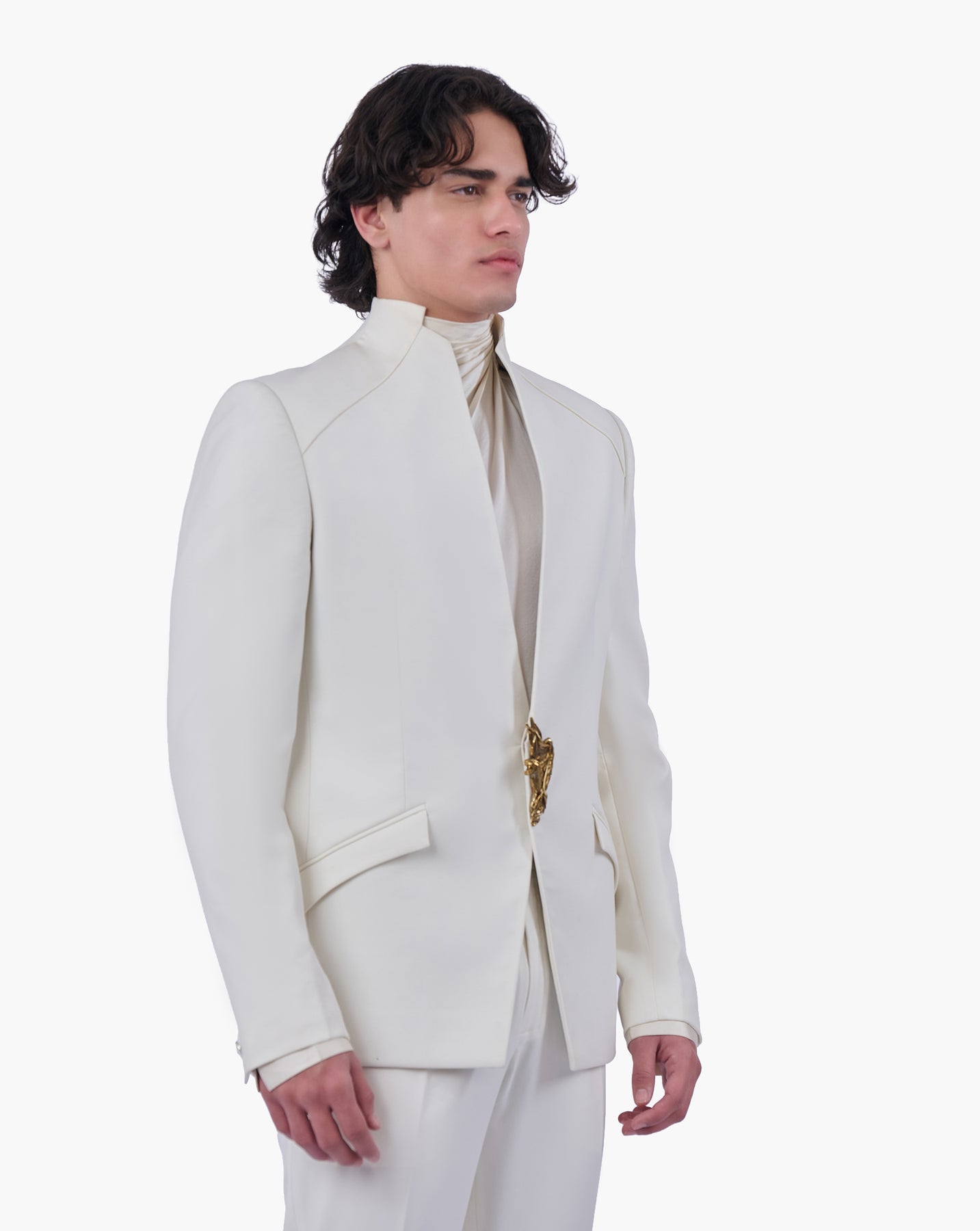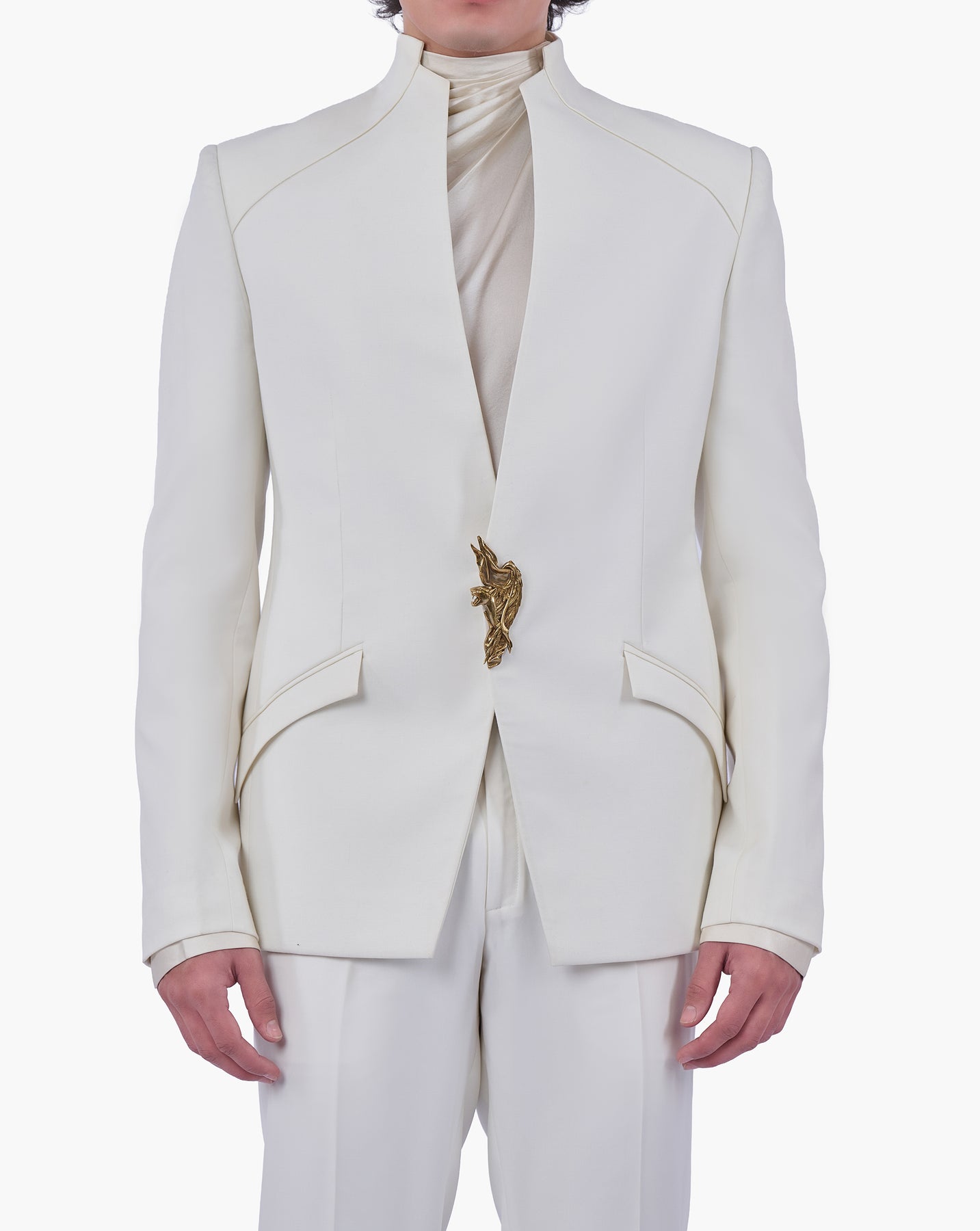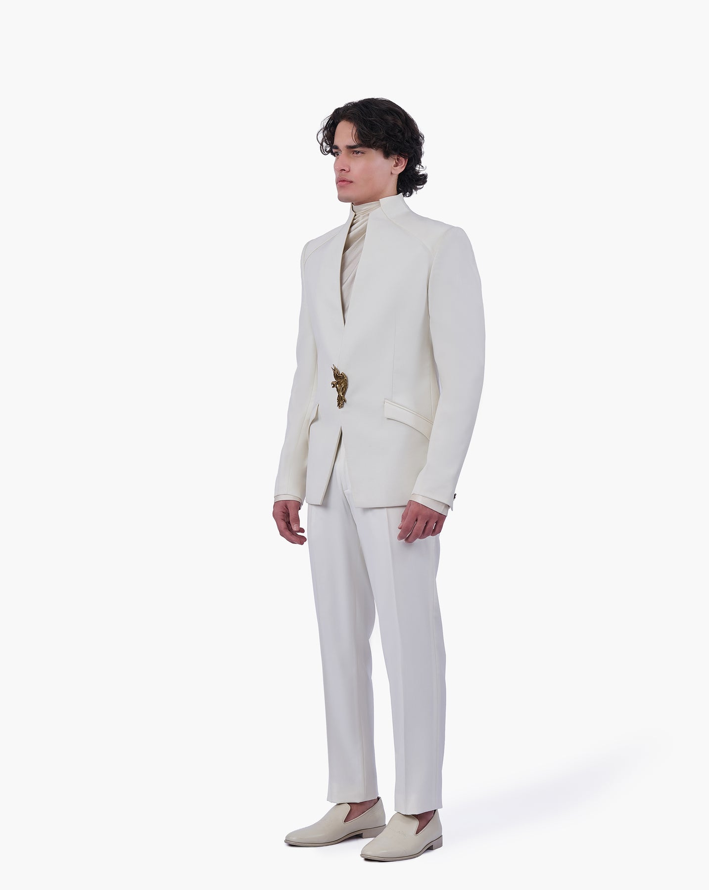 Ecru front-open bandhgala finished with a sculptural panther wing and swan crest brooch.