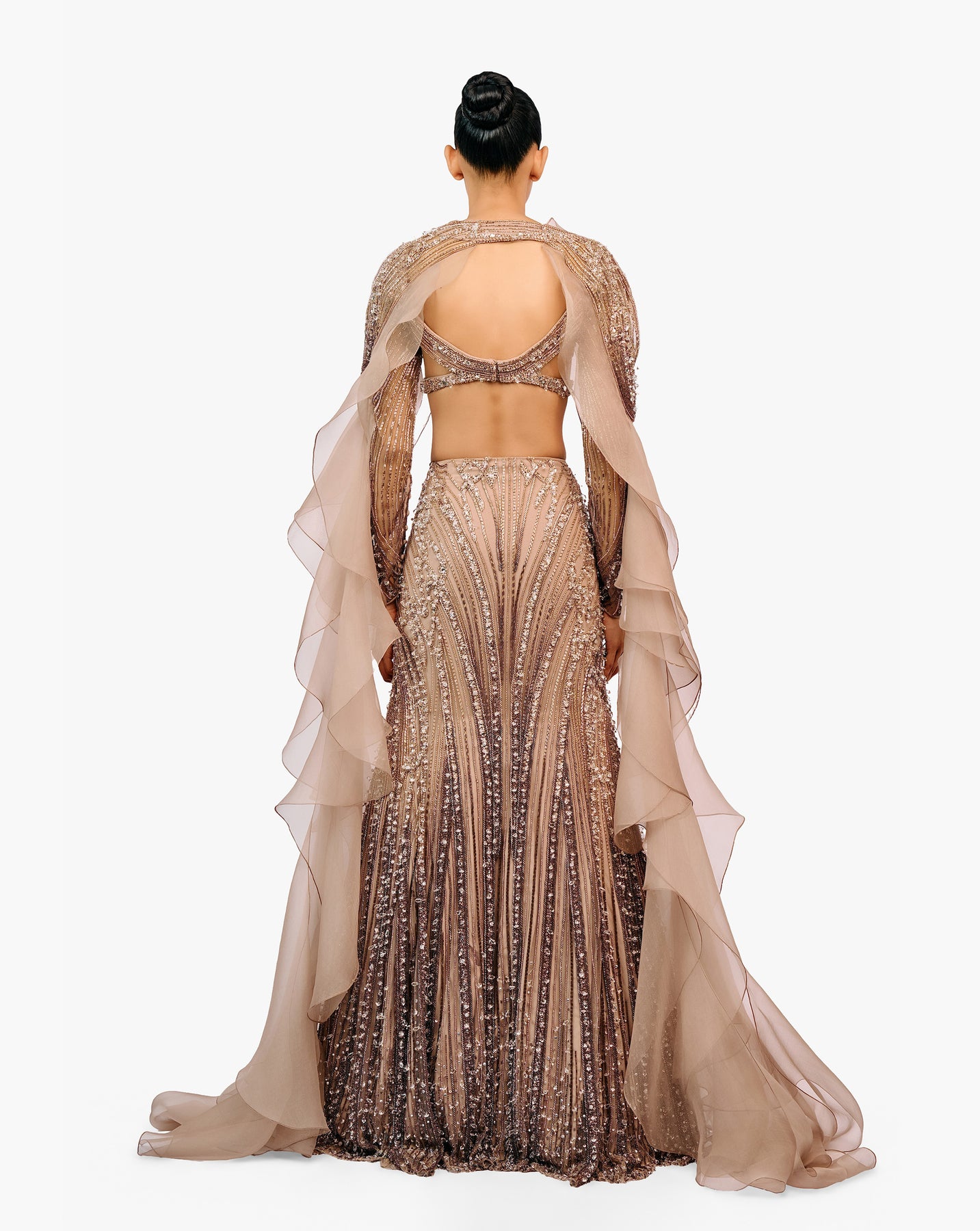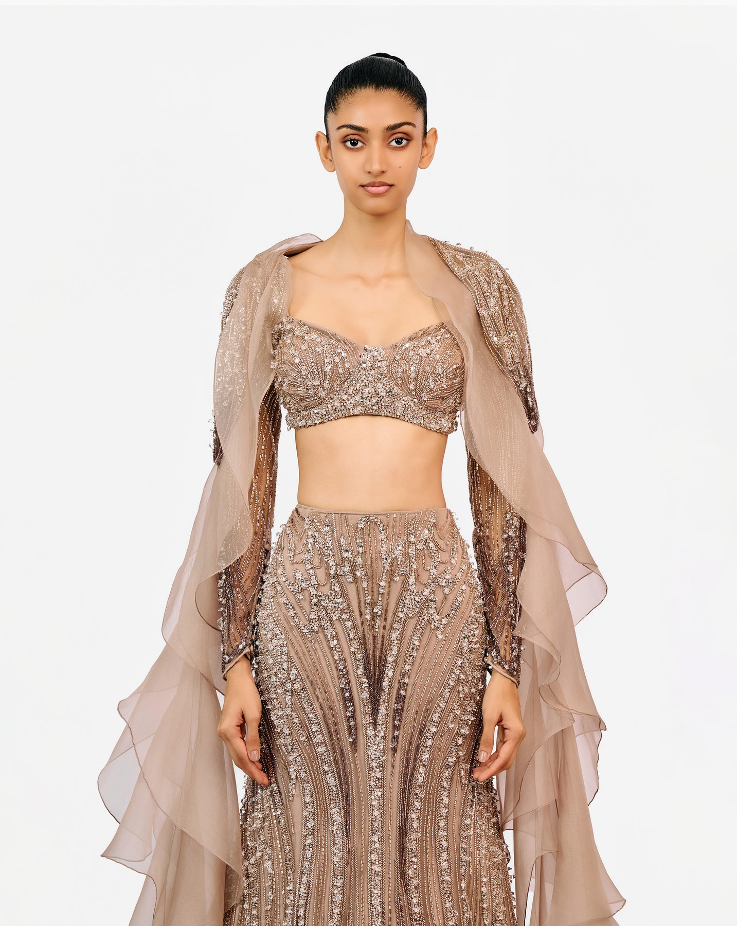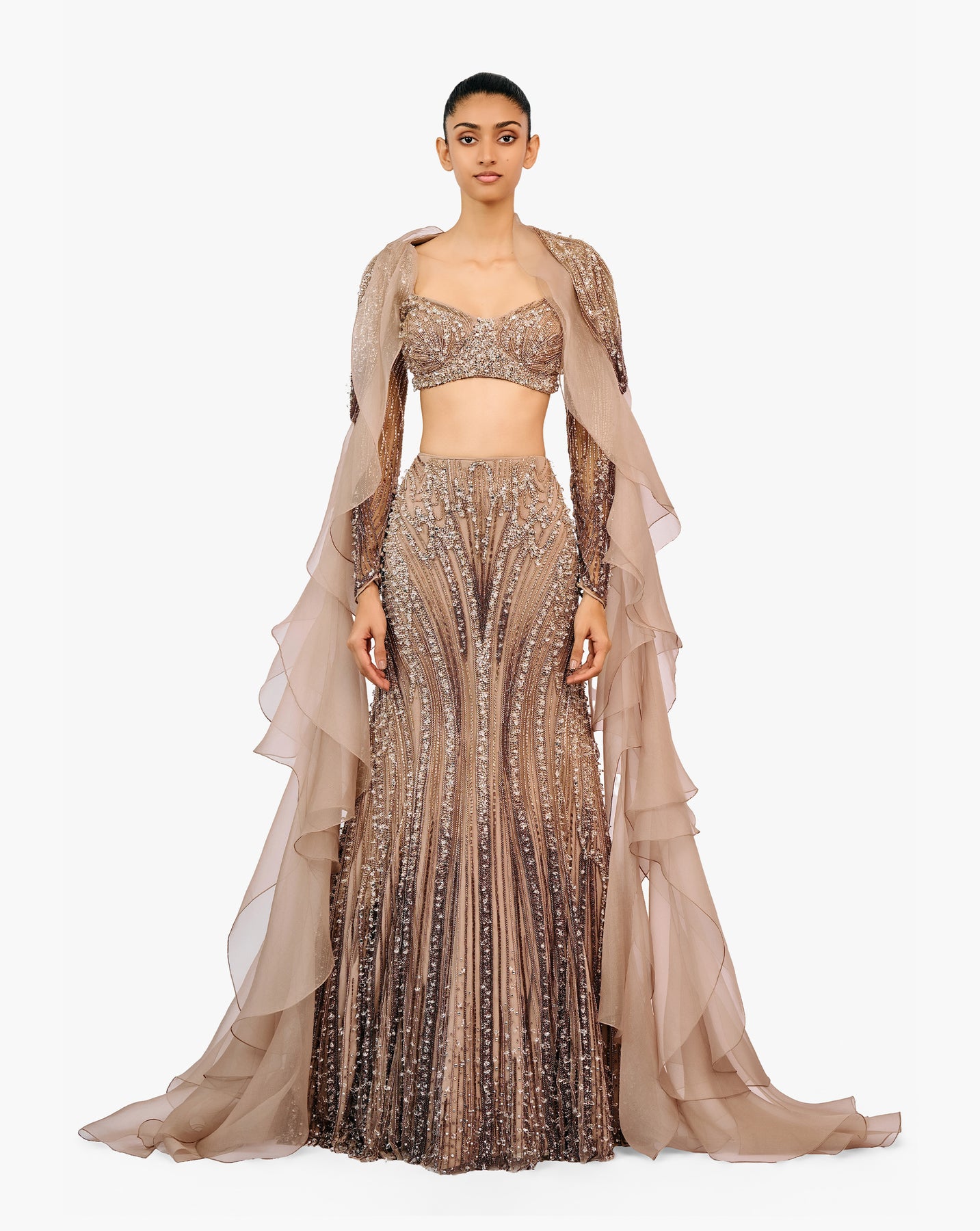 Haze champagne lehenga with tonal crystal and sequin embroidery, paired with a sculpted blouse and a layered ruffle cape.