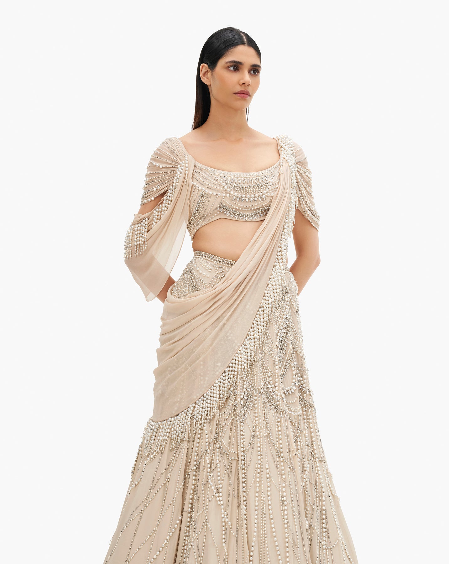 Roman ecru cowl sleeved blouse with pearl embroidery.