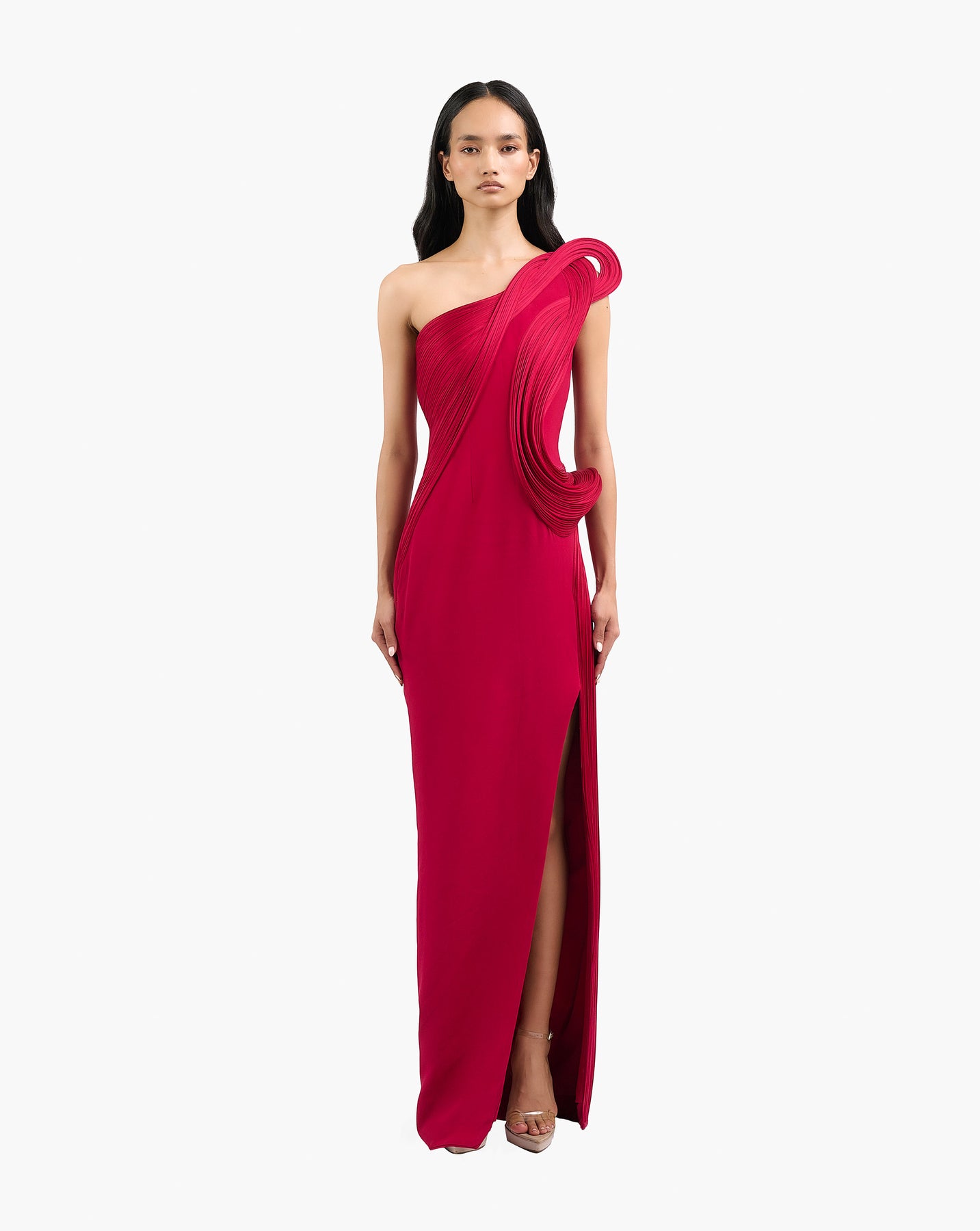 Fuschia crepe gown with sculpted silk satin molded across the bodice.