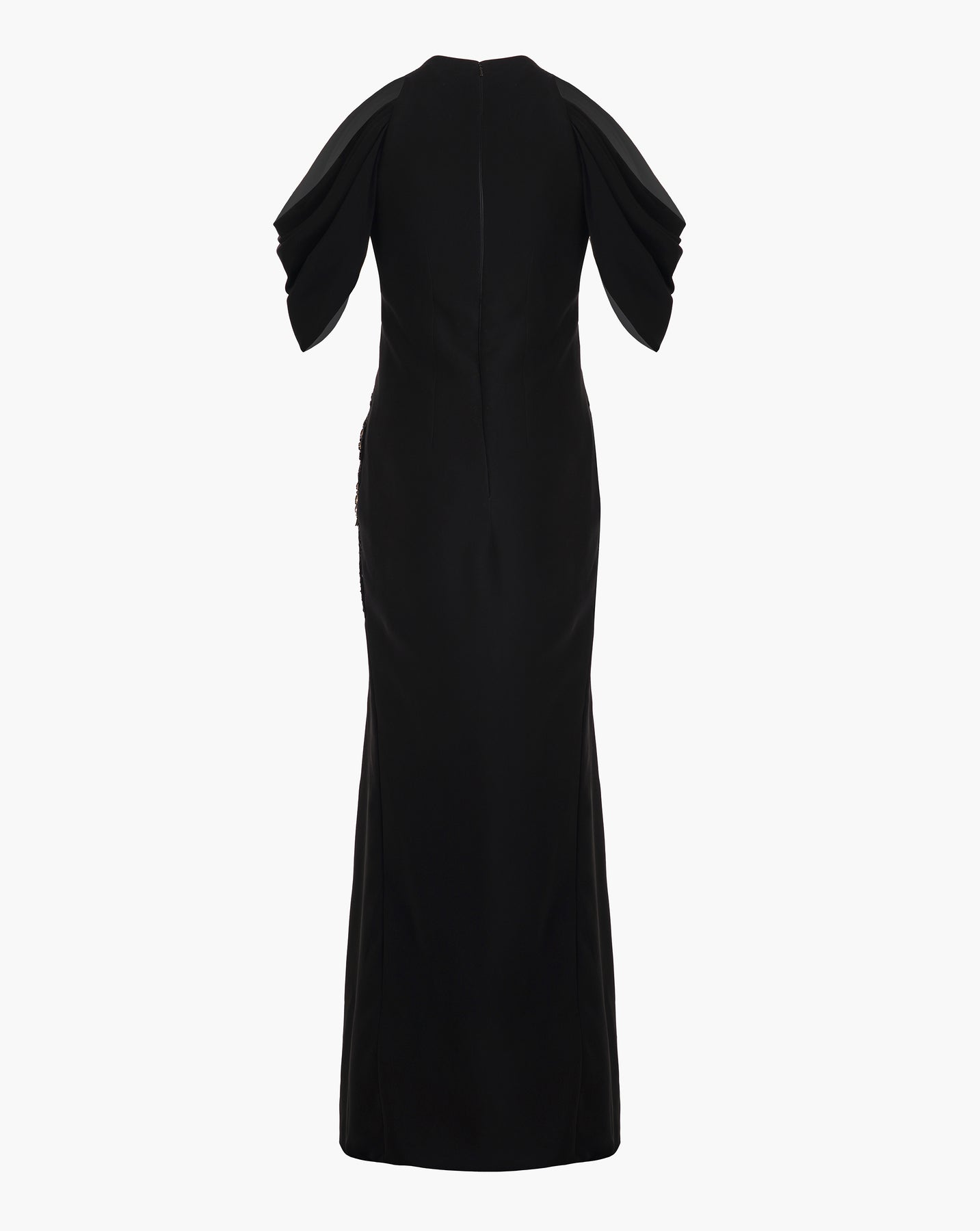 Black halter draped gown with tonal refraction embroidery and cowl draped sleeves.