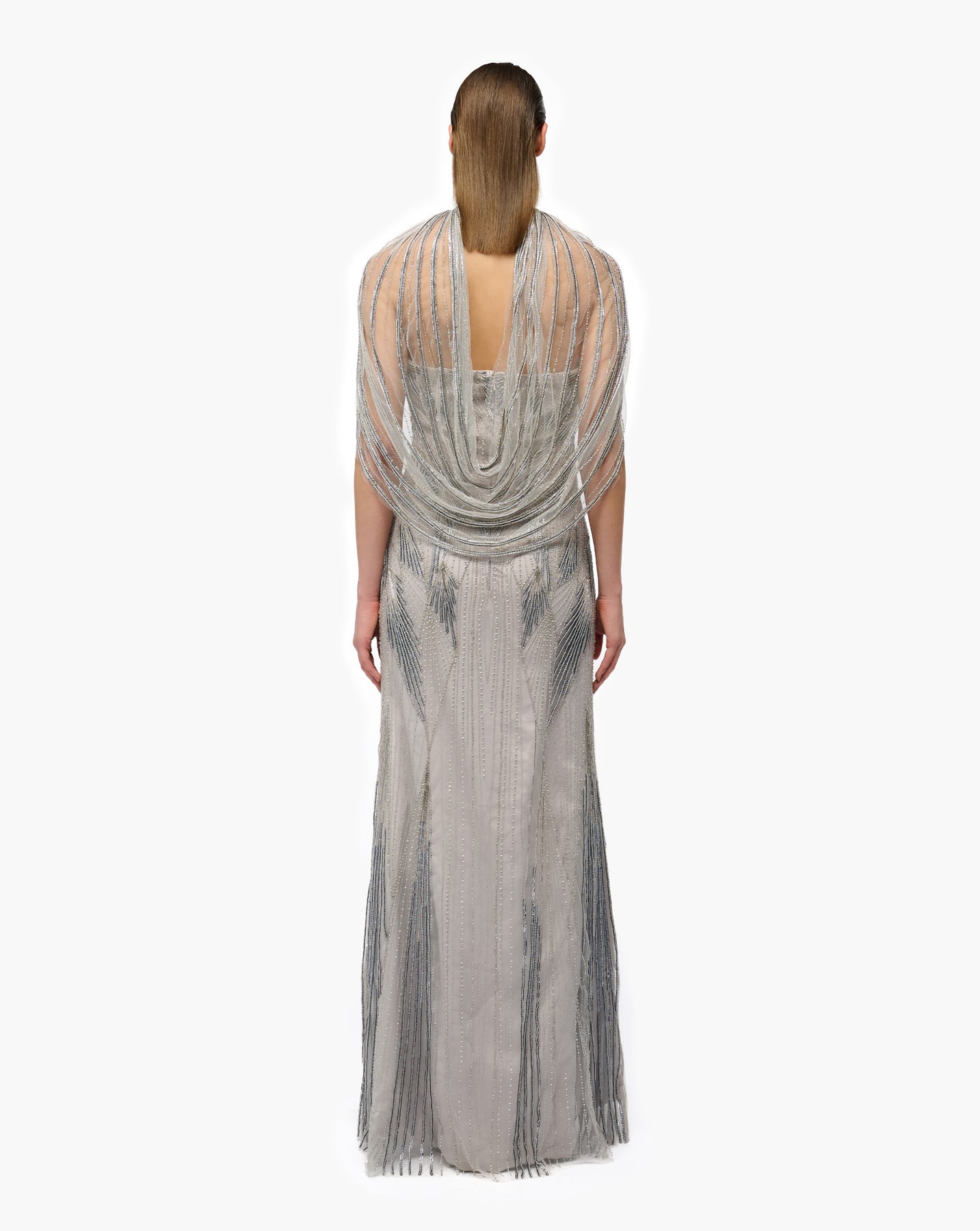 Tulle gown in silver with a high neckline, prismatic glass embroidery and a cascading twilight cowl cape.