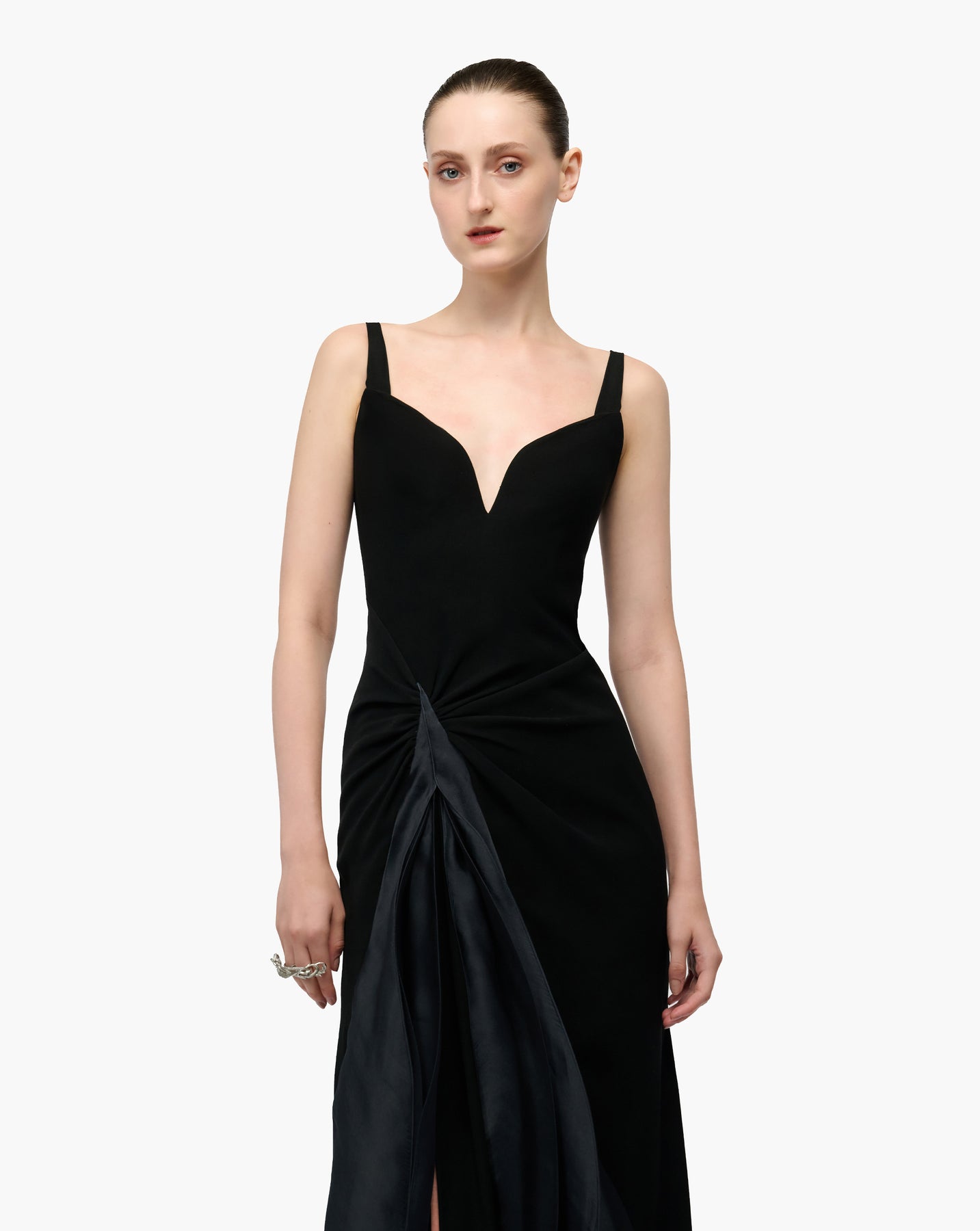 Black draped gown with a front slit and cascading ruffles.