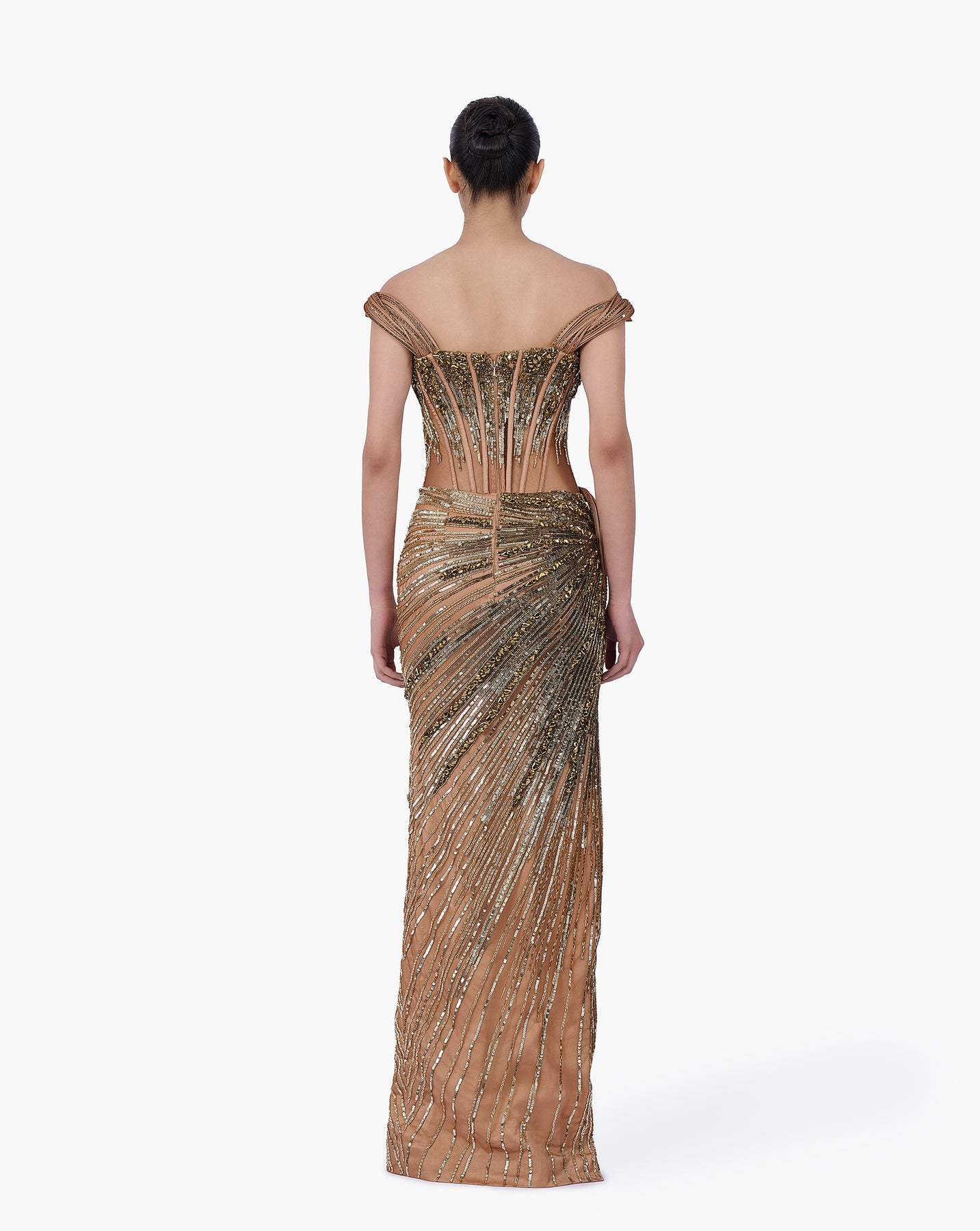Antique gold gown featuring a structured corset bodice with sculpted illusion detailing, a draped skirt with gathered waist placement and a high-slit silhouette finished with linear embellishment.
