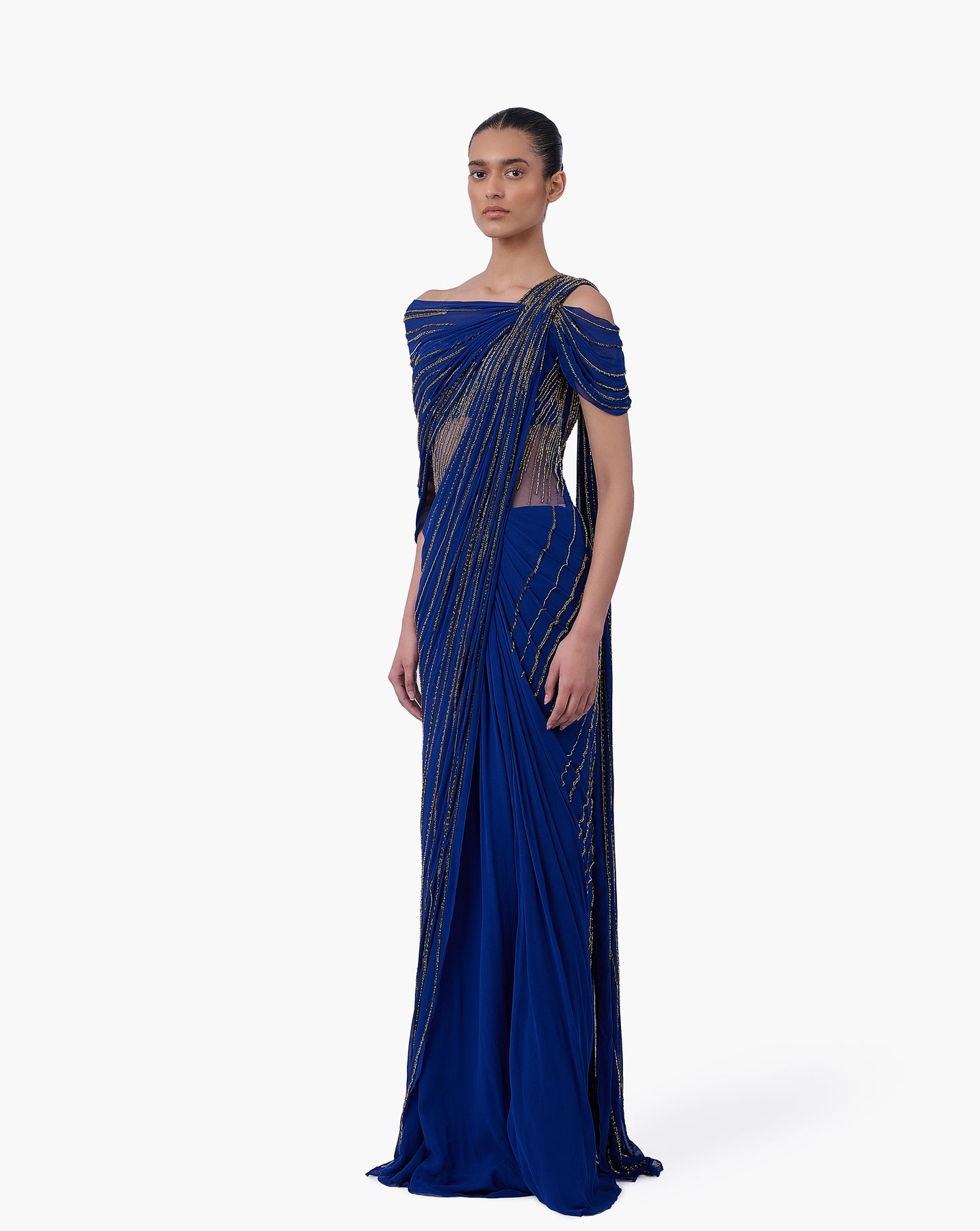 Royal blue saree gown featuring radiating linear embellishment with an asymmetric draped silhouette.