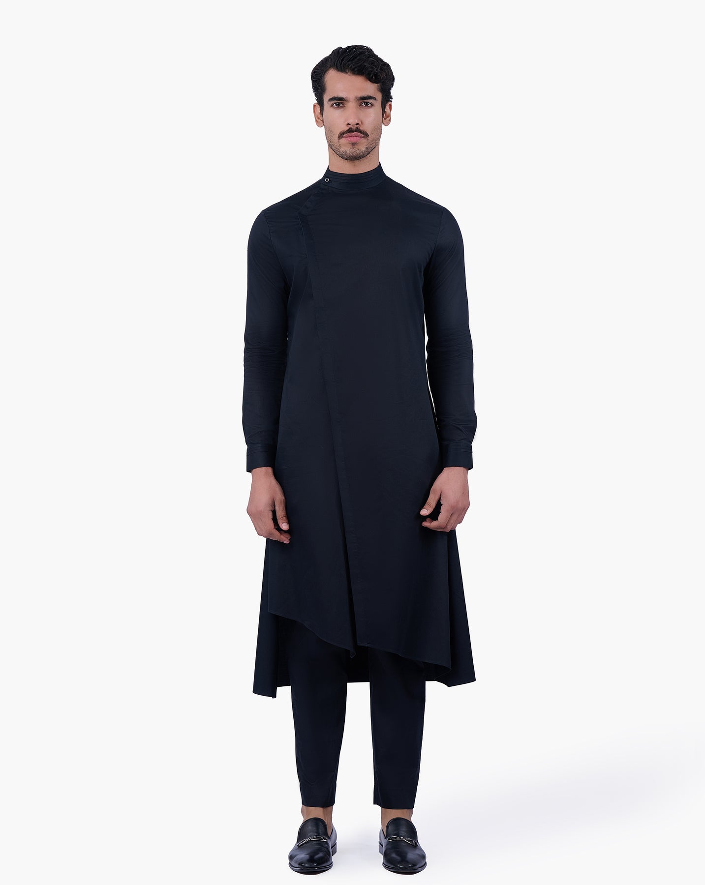 Black cotton kurta defined by an asymmetrical Orion line construction paired with matching trousers.