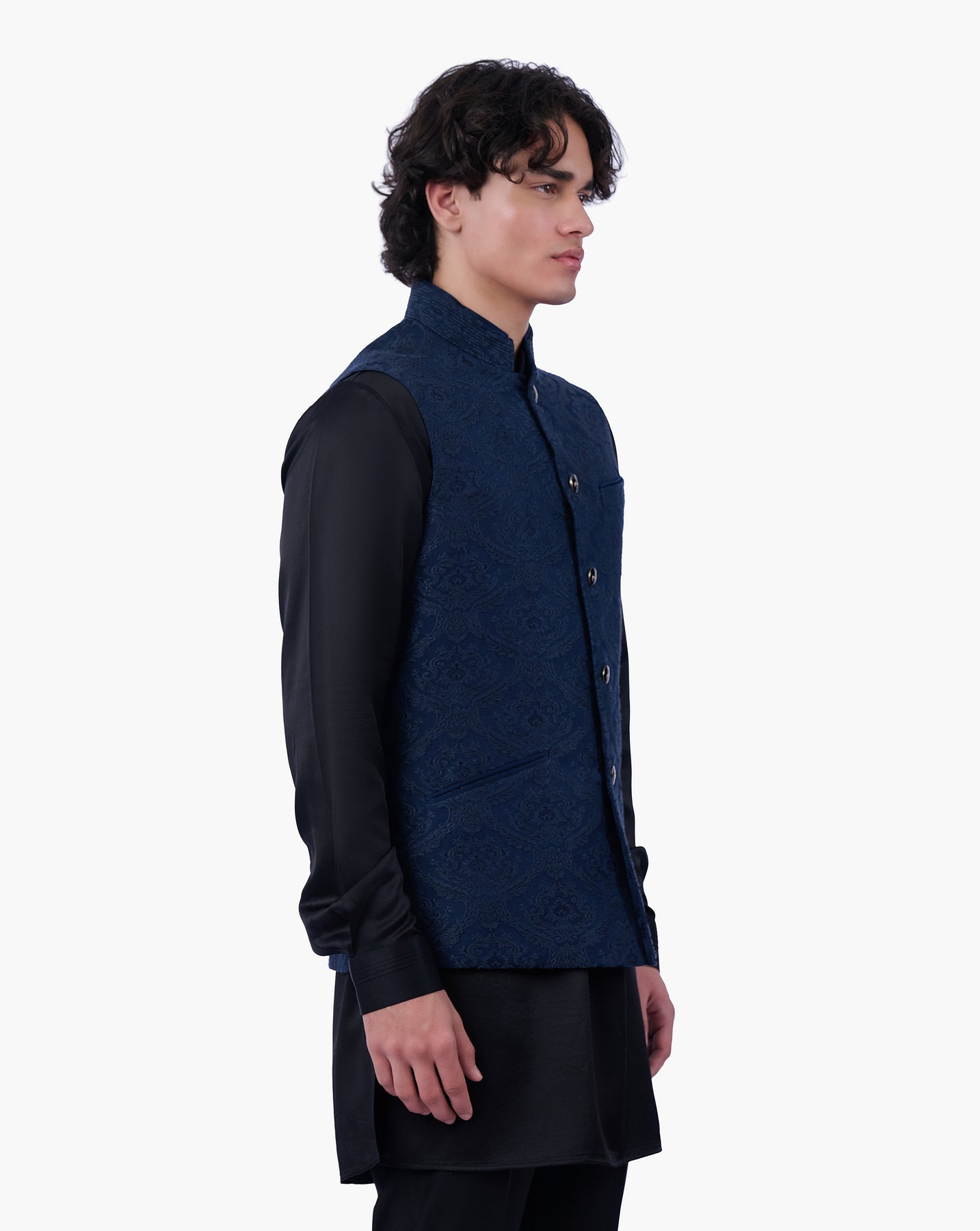 Midnight brocade Nehru jacket finished with classic centaur buttons