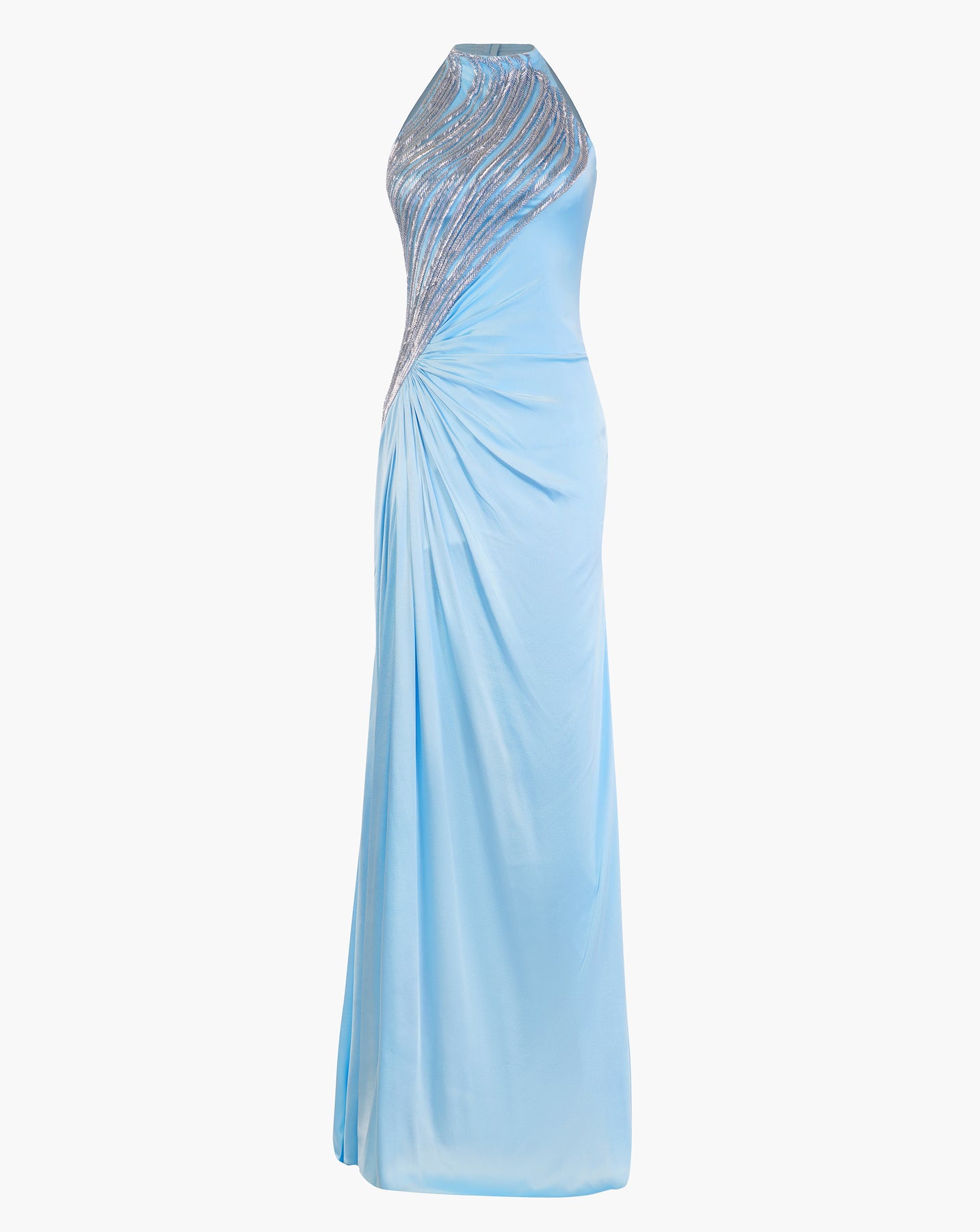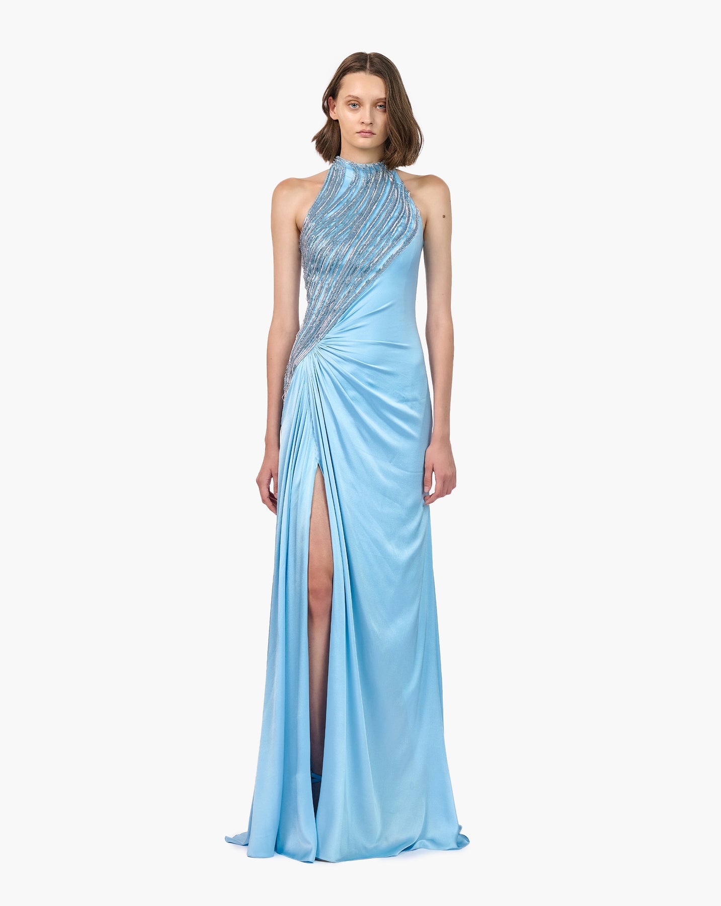 Cloud blue silk satin draped gown with blue glass wave embroidery.