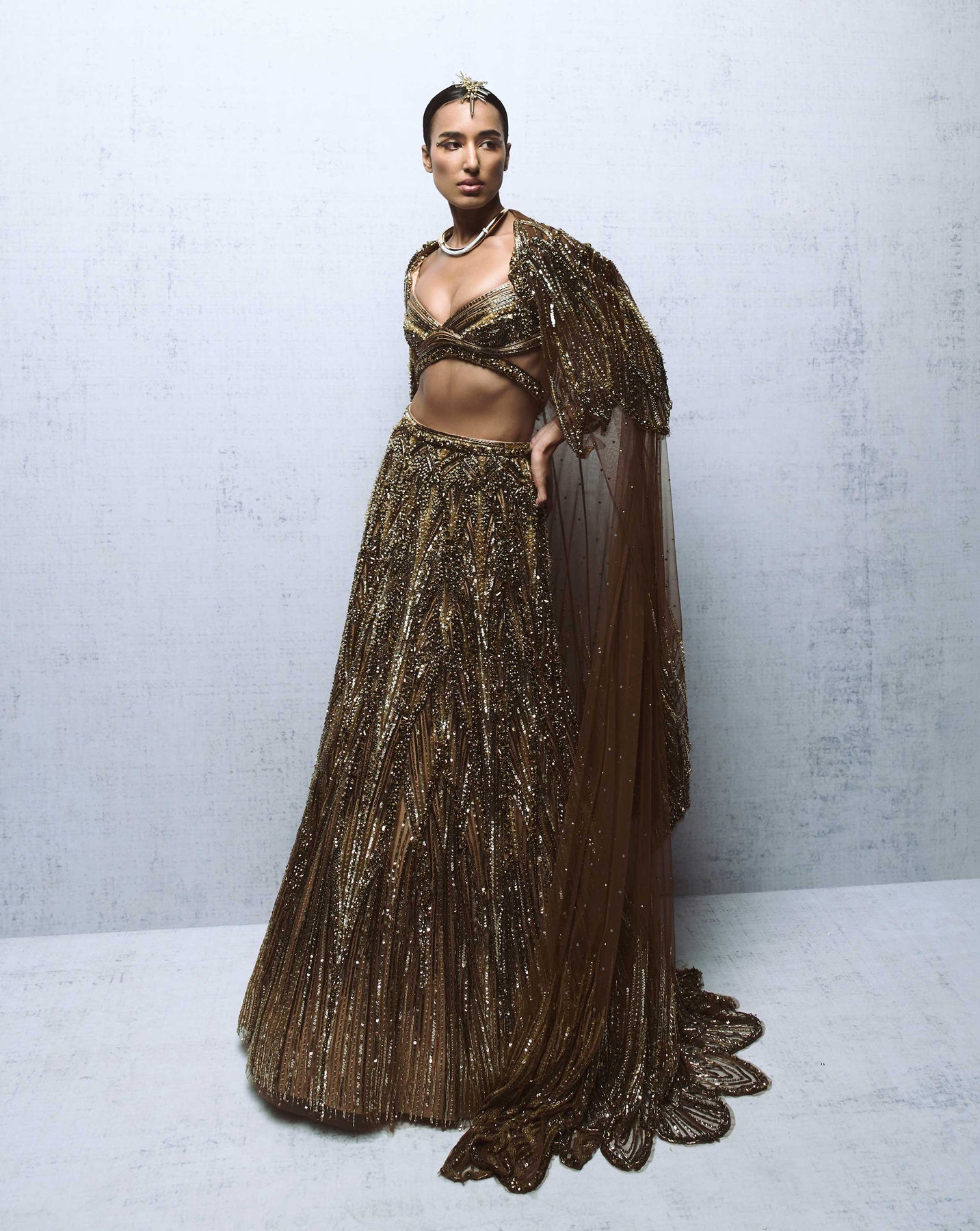 An architectural crystal and bugle-bead embellished lehenga, paired with a three tier cape and a sculpted-neckline blouse, for a structured yet opulent statement.