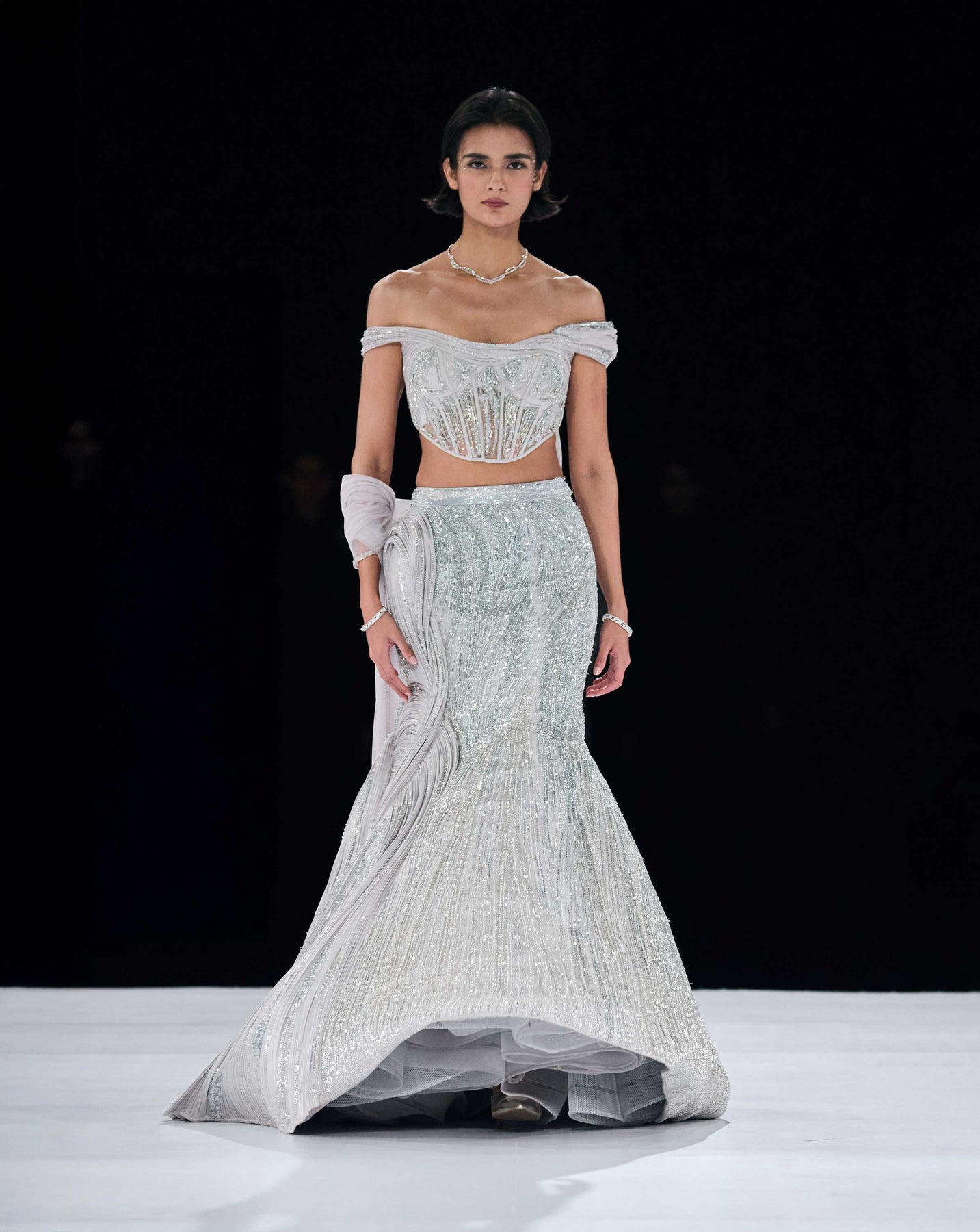 An embroidered mermaid lehenga with a sculpted neckline blouse and Art Nouveau bugle bead and crystal embroidery. The fluid lines contour the body before cascading into dramatic drapes and voluminous folds, creating an ethereal blend of architecture and movement.