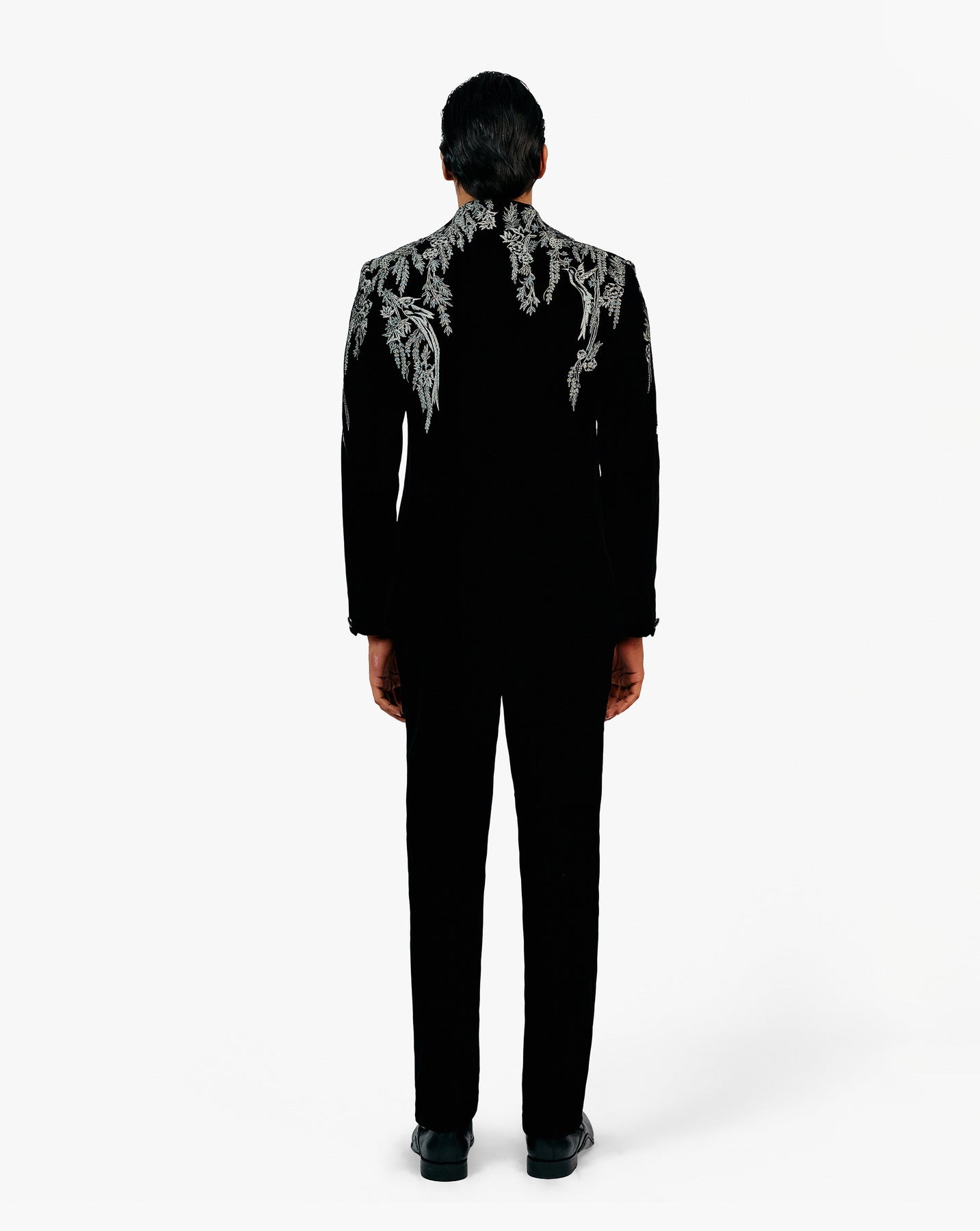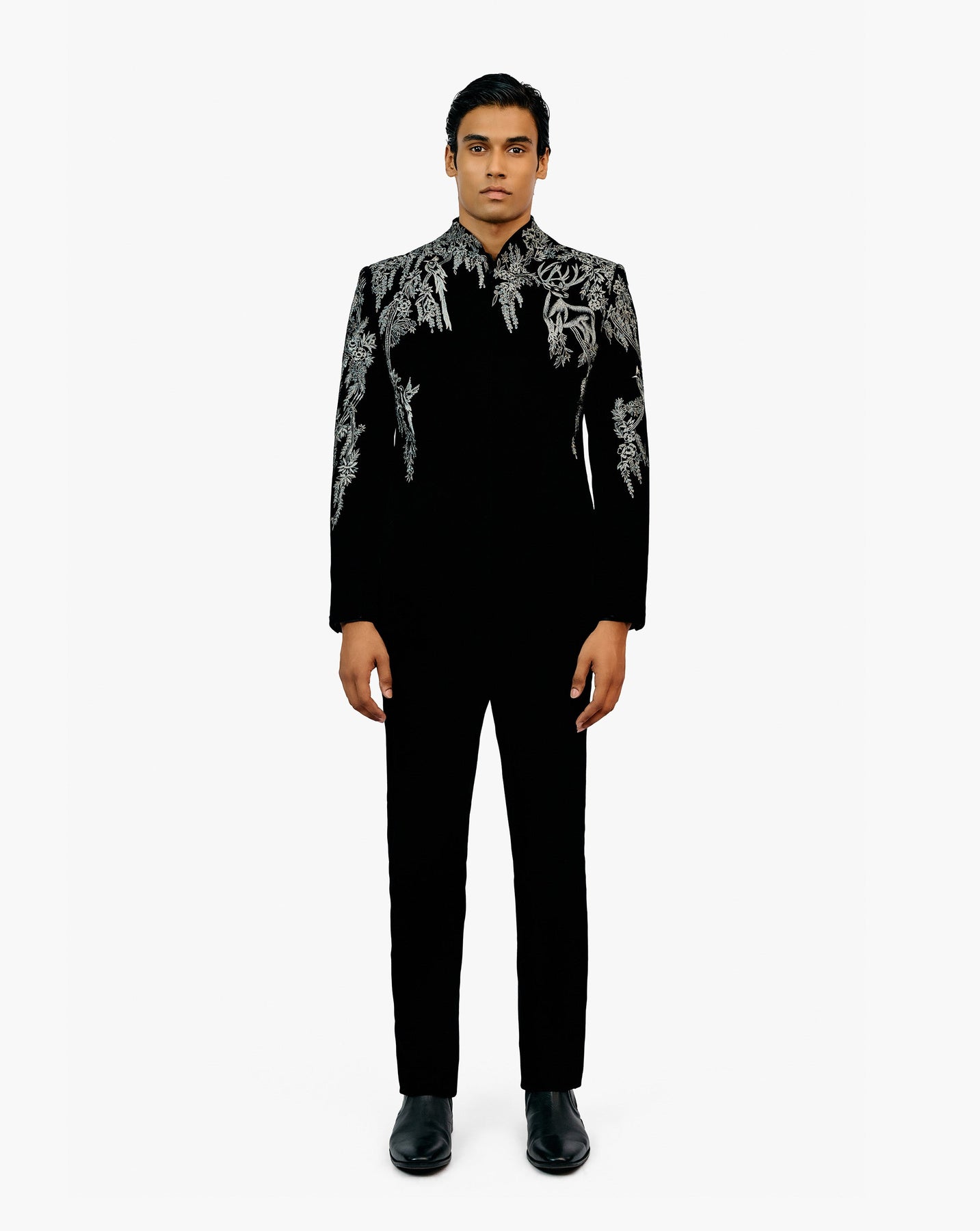 Structured midnight blue velvet bandhgala with intricate floral embellishments.