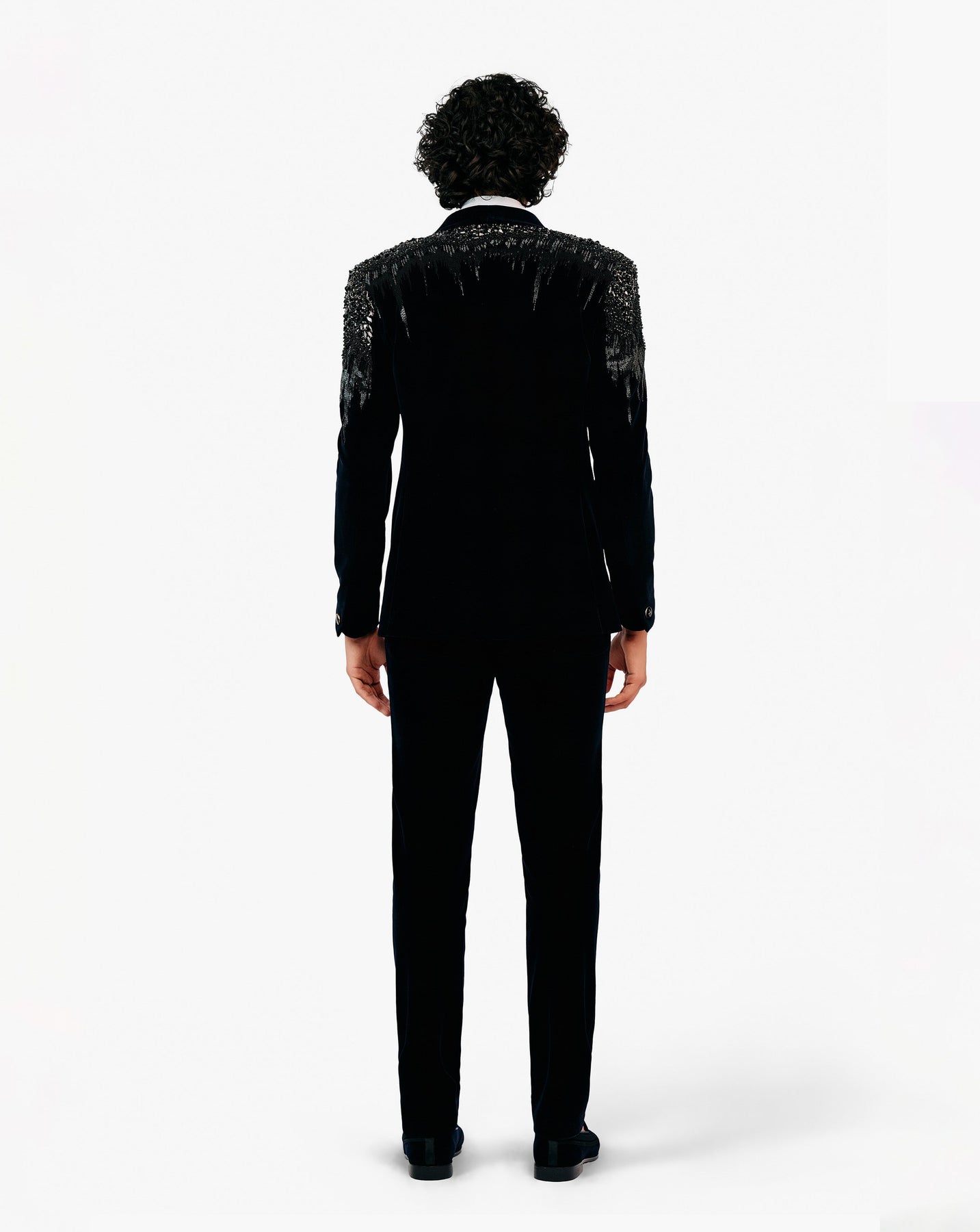 Black velvet tuxedo with bugle bead and crystal embroidery cascading from the shoulders.
