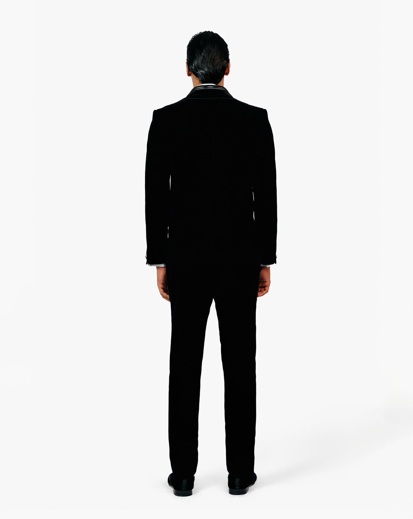 Black velvet tuxedo with sculpted lapel and refraction embellishment.