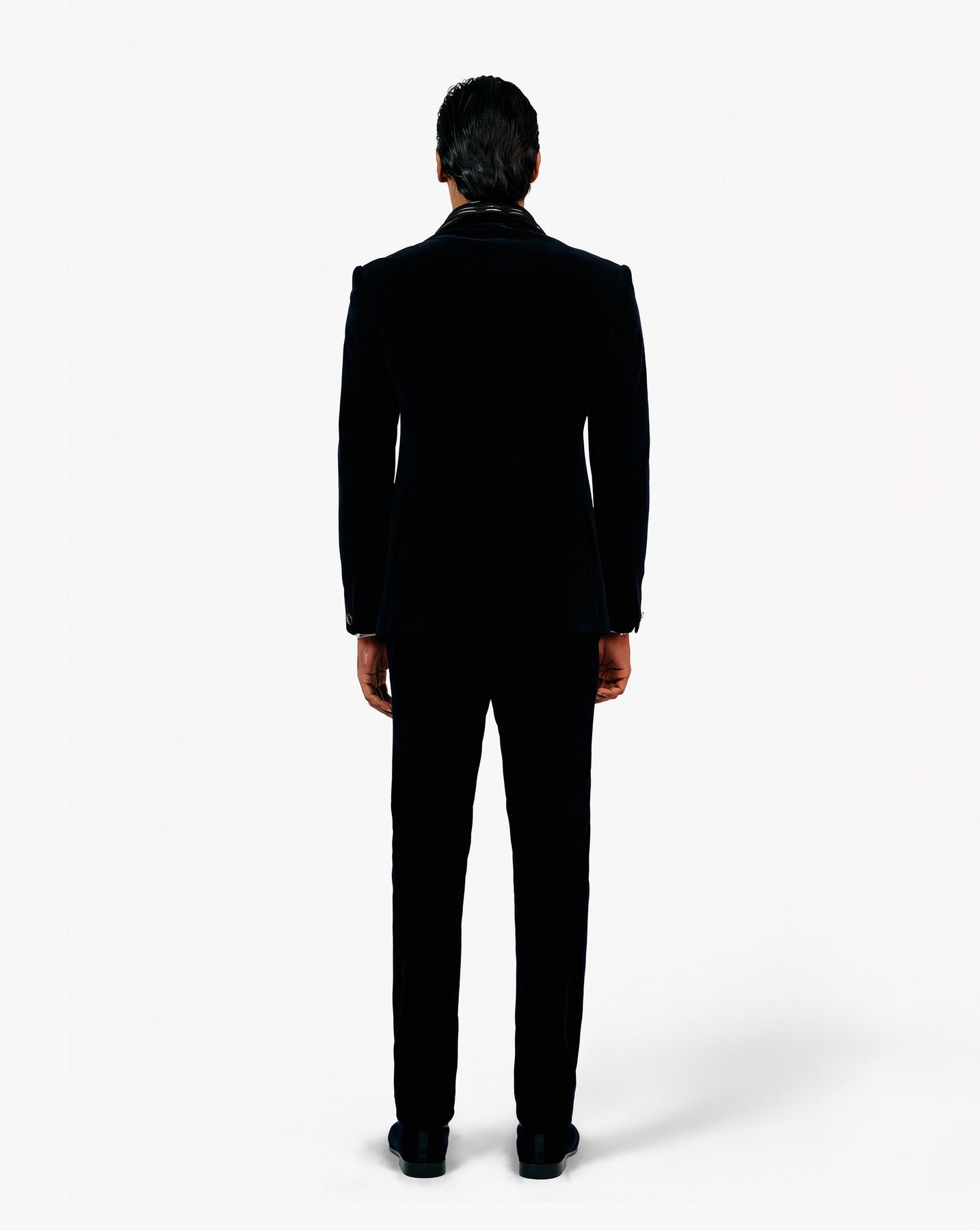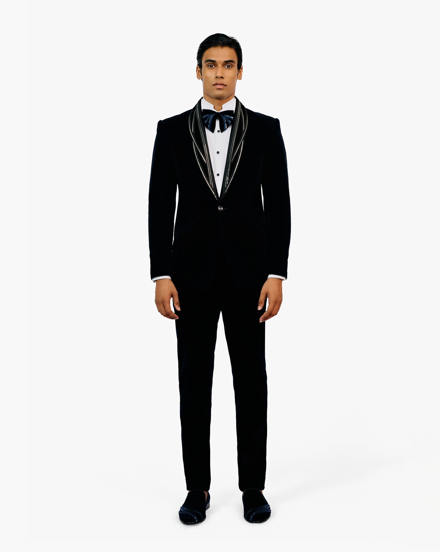 Midnight blue velvet tuxedo with sculpted lapel and refraction embellishment.