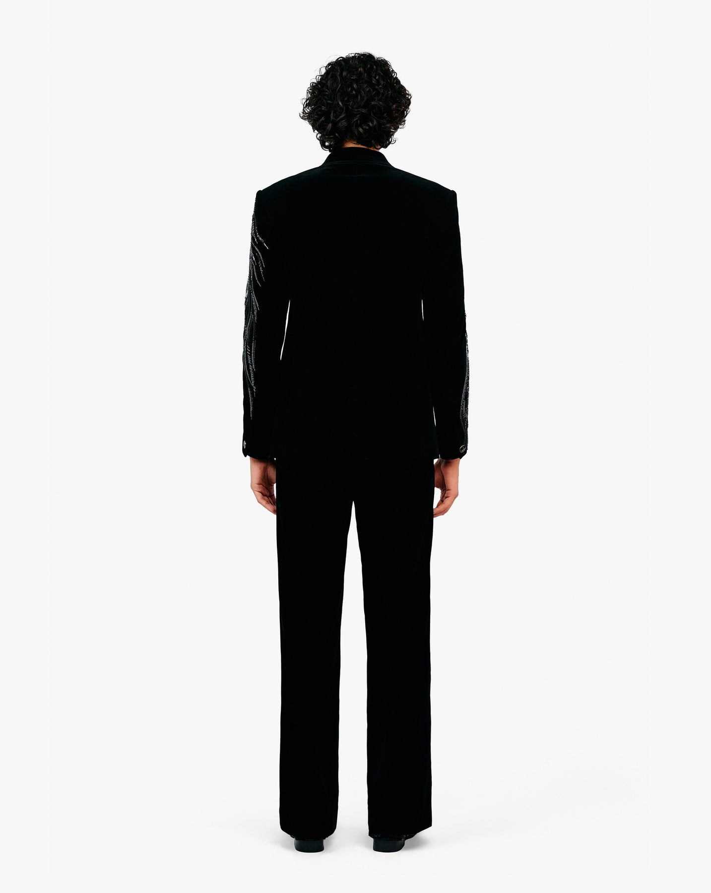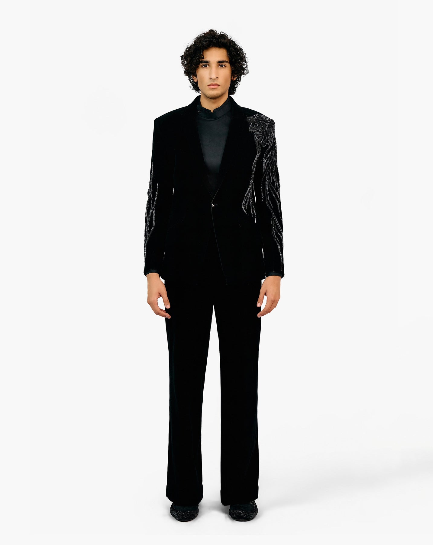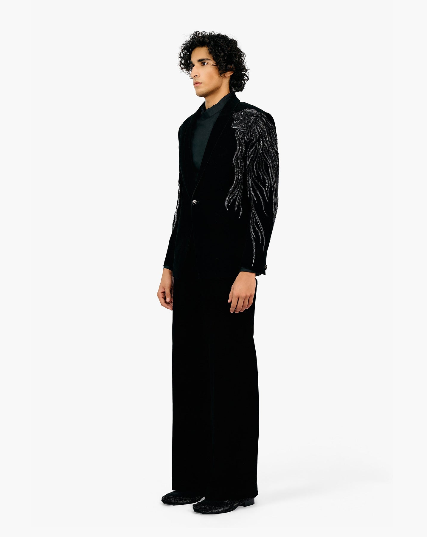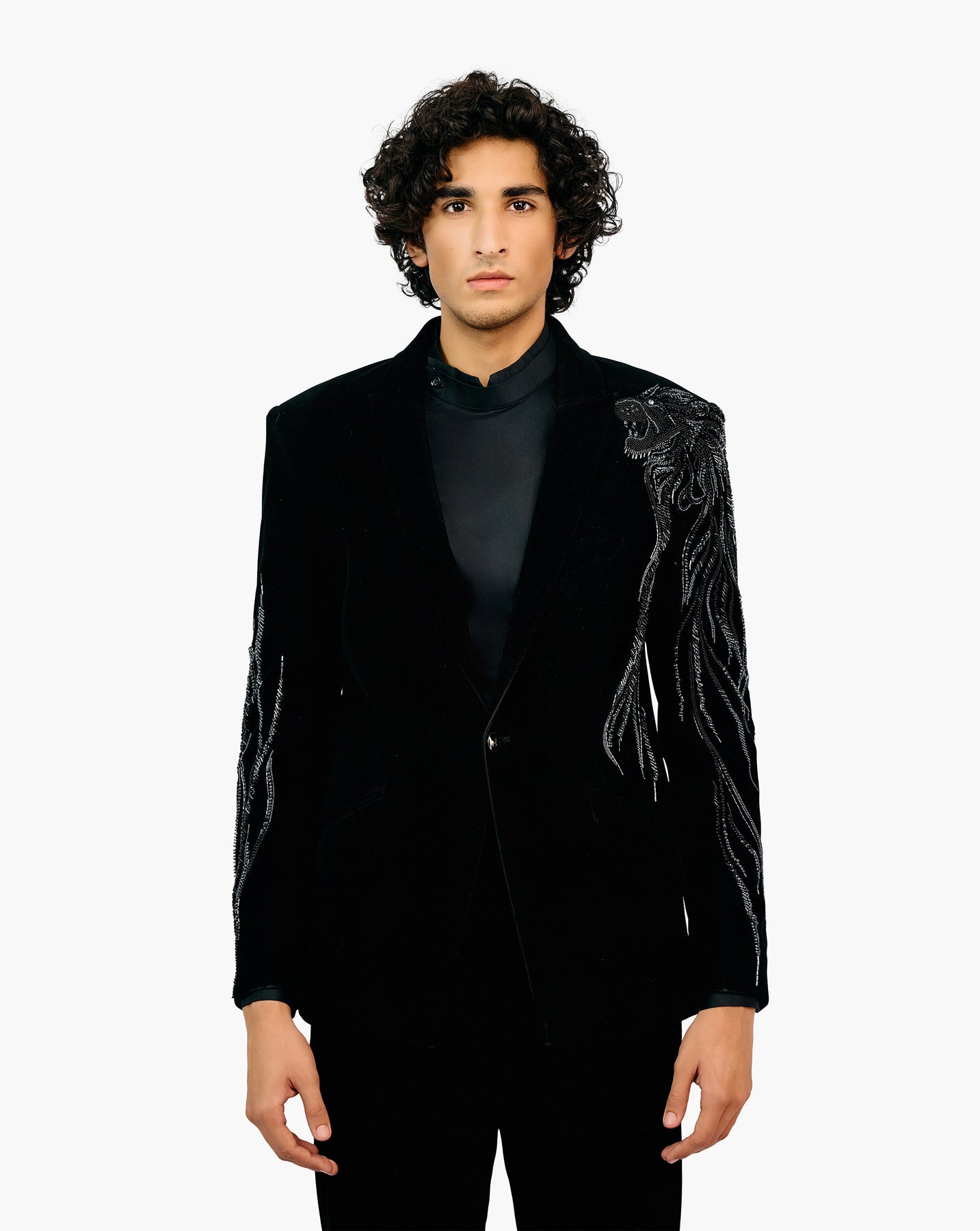 Black velvet tuxedo with lion detailing.