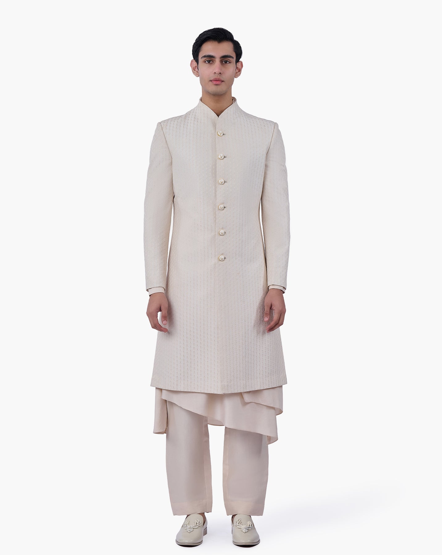 Champagne self-textured sherwani finished with sculpted stag crest buttons