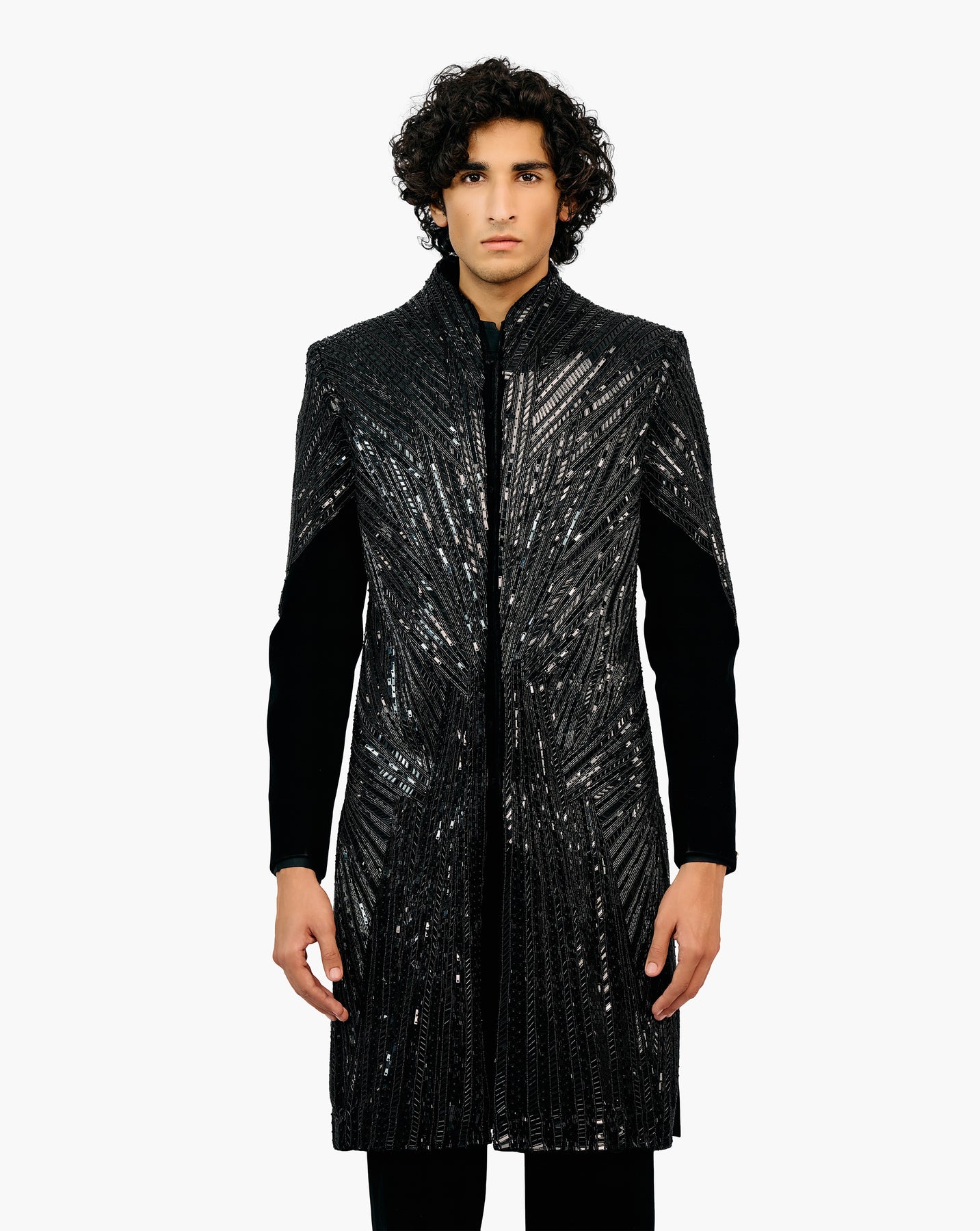 Model wearing black coat with silver patterns with black pant by Gaurav Gupta
