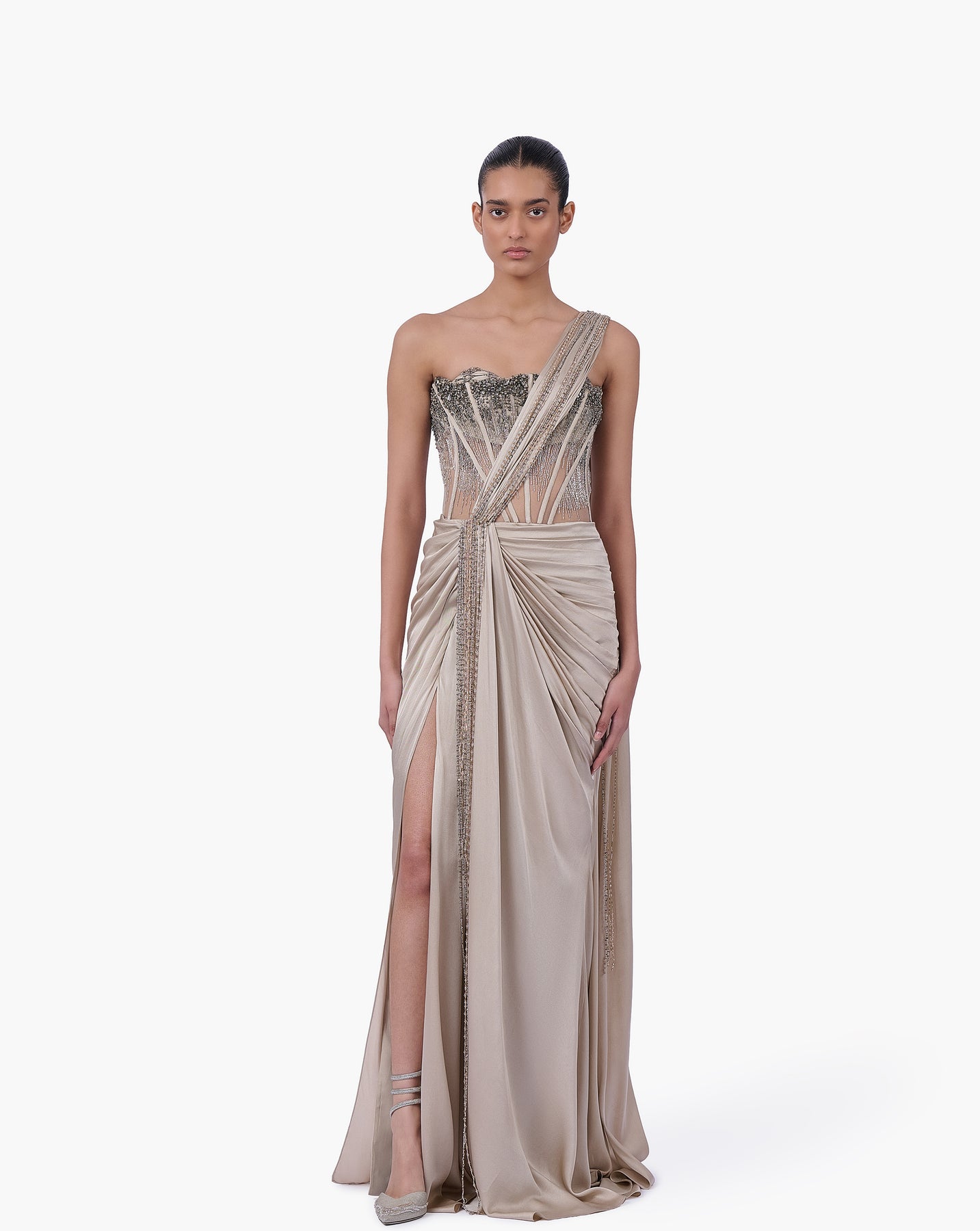 Saree gown featuring contemporary satin draping with a 3D corset, crystal beading, shaded metallic embroidery, and cascading tassel detailing.