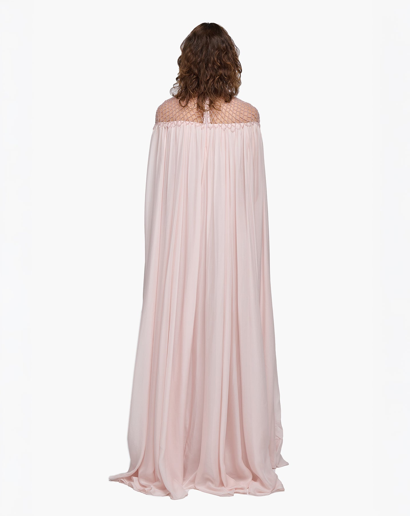 A pearl-pink A-line kaftan with crystal macramé air beading on the shoulders.