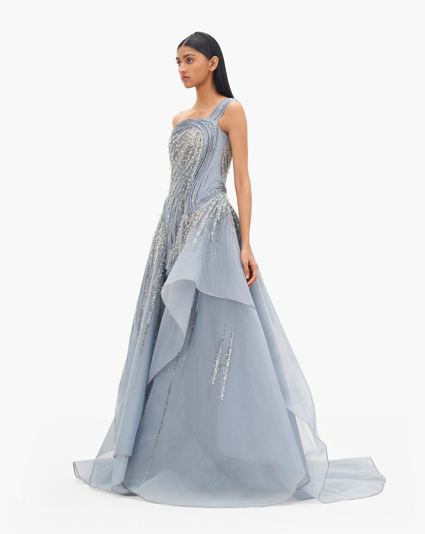 Cosmic embellished gown with a sculpted hemline.