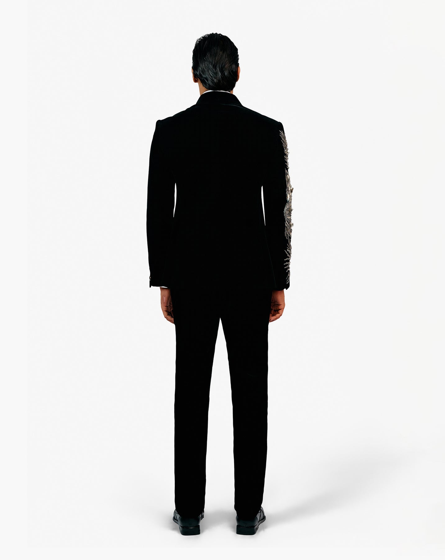 Black velvet tuxedo with silver 3D metallic embroidery in winged, flame-like motifs across the front and sleeve.