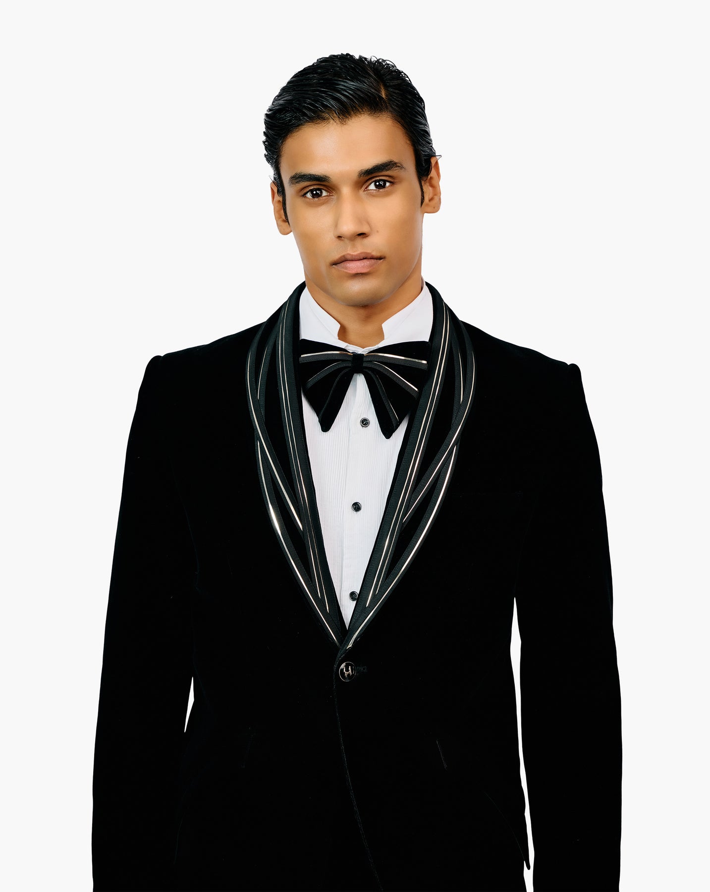 Black velvet tuxedo with sculpted lapel and refraction embellishment.