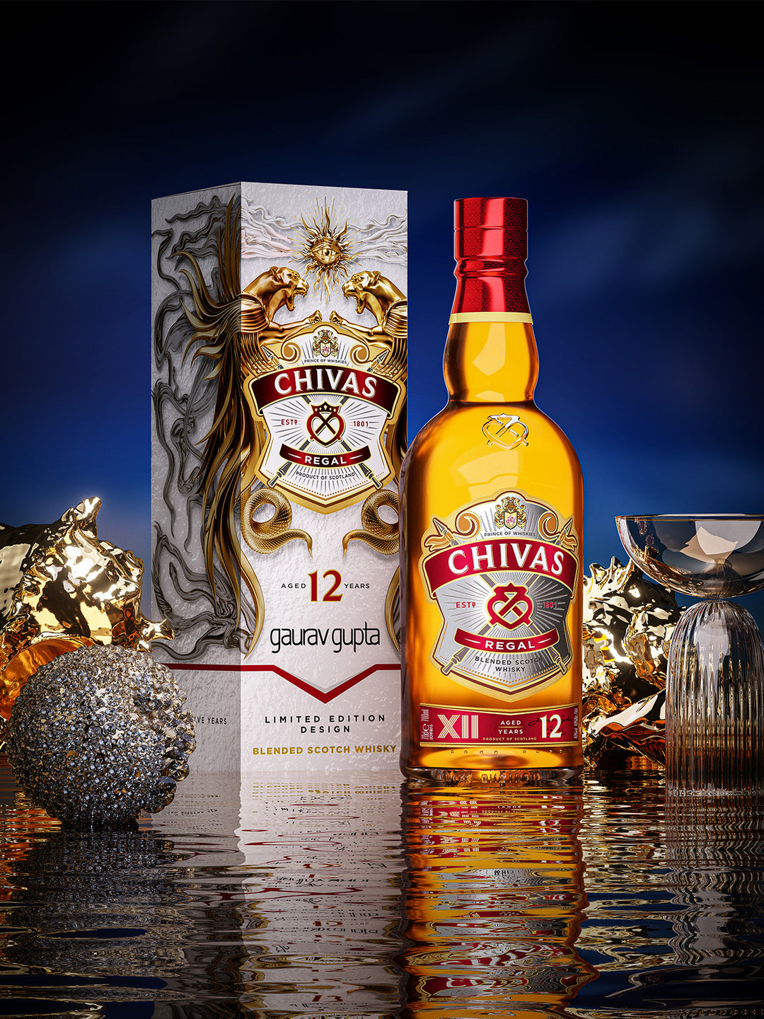 sensuality, while the ethereal silver Chivas Regal 12 x Gaurav Gupta embodies elegance and renewal. Together, they