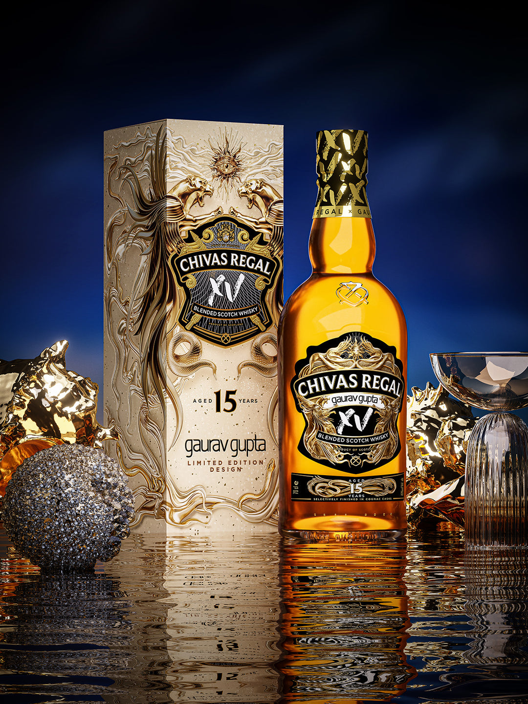 captures the essence of transformation. The golden Chivas Regal XV x Gaurav Gupta evokes opulence and bold