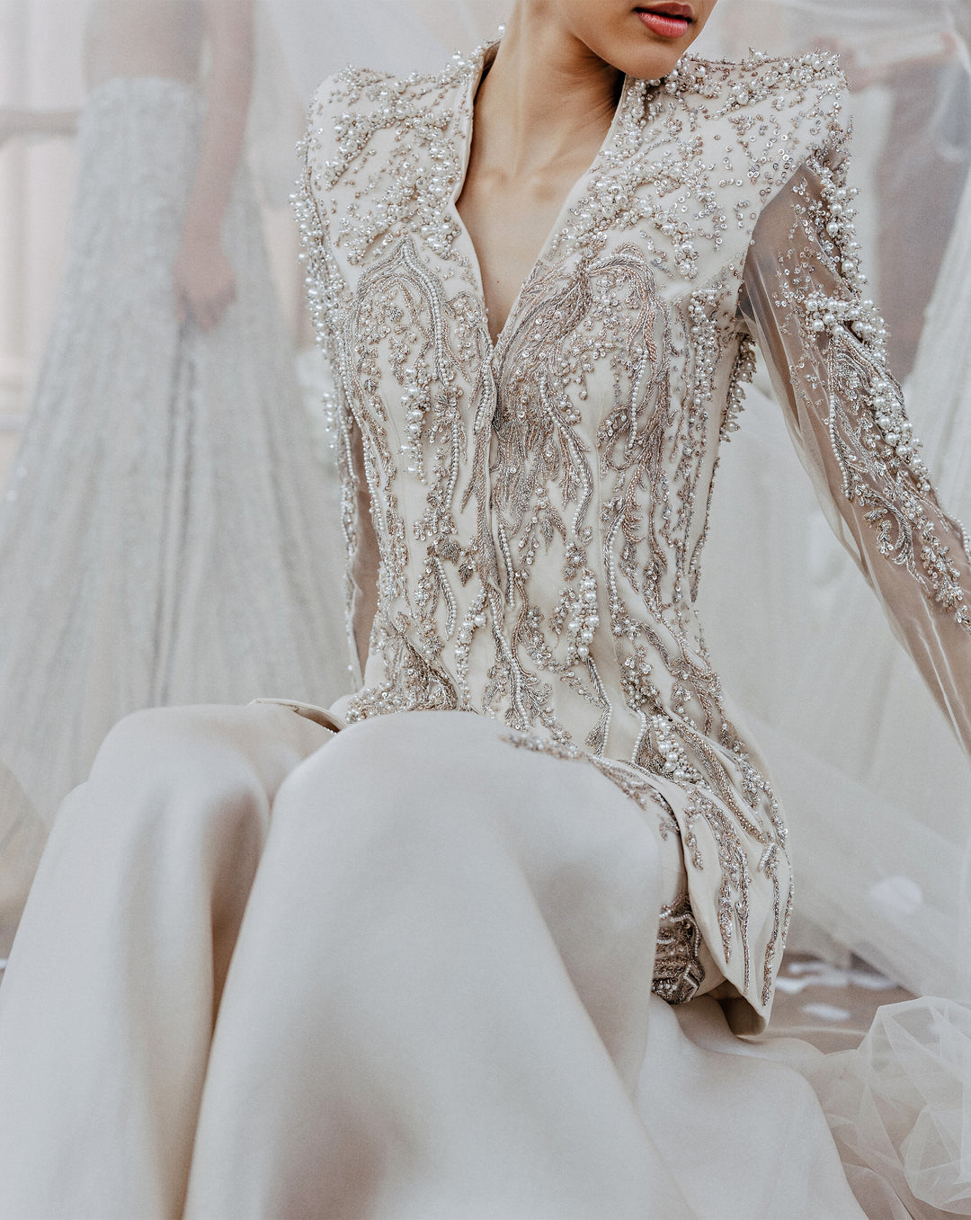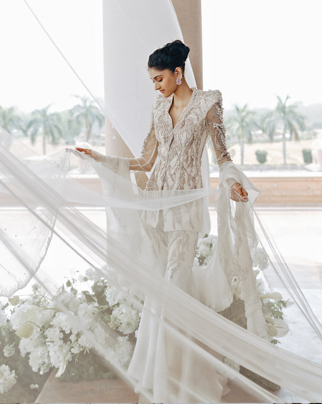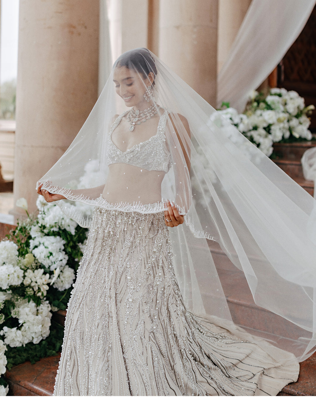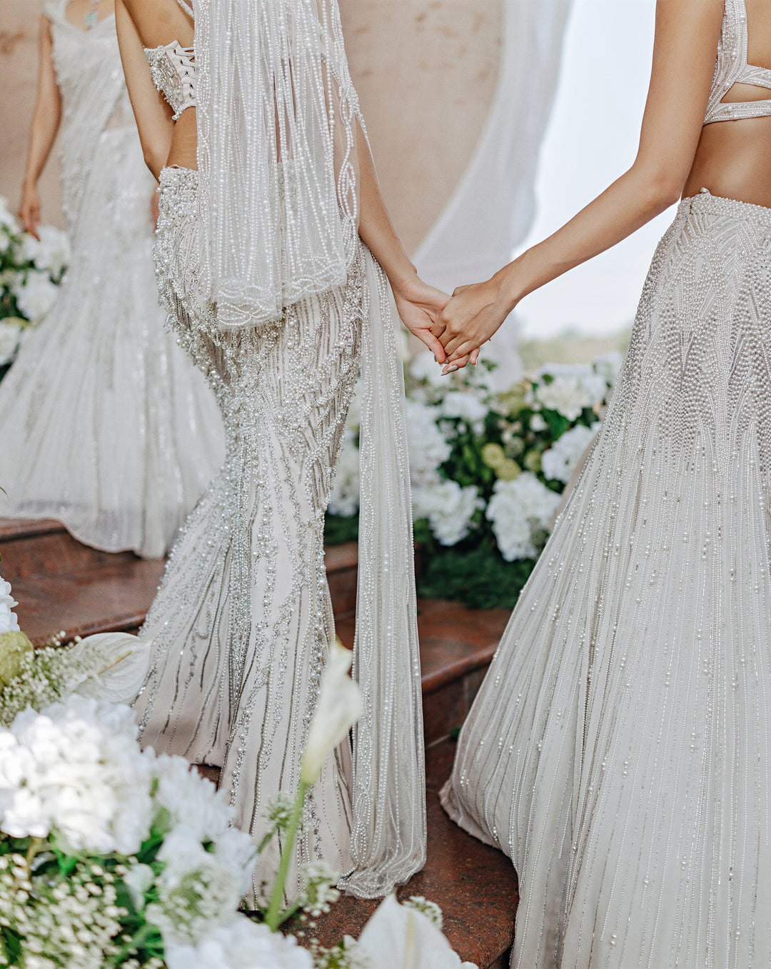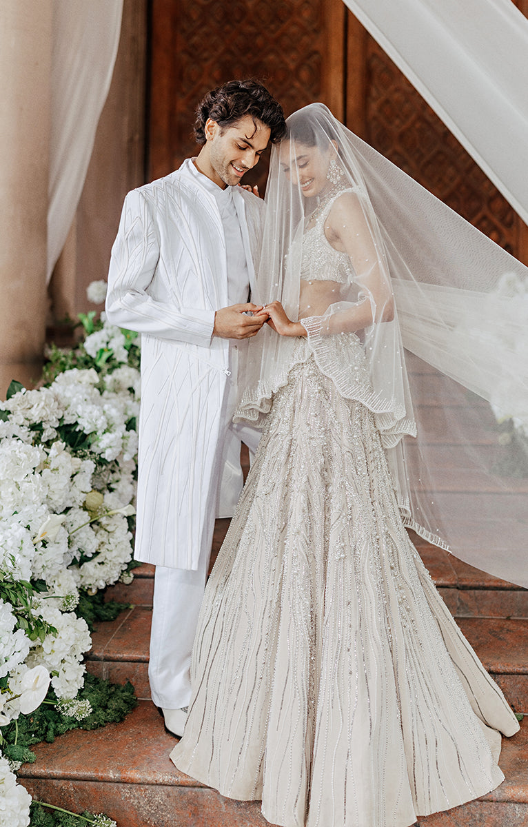 A poetic interplay of tradition and innovation, The Vow reimagines the bridal moment in ivory. Drawing from cosmic inspiration, the Pearl Edit features glass embroideries, luminous pearls, and iridescent crystals that shimmer like stardust. These elements, meticulously hand-embroidered by Indian artisans, create light-infused surfaces that speak to the sacredness of the wedding ritual.