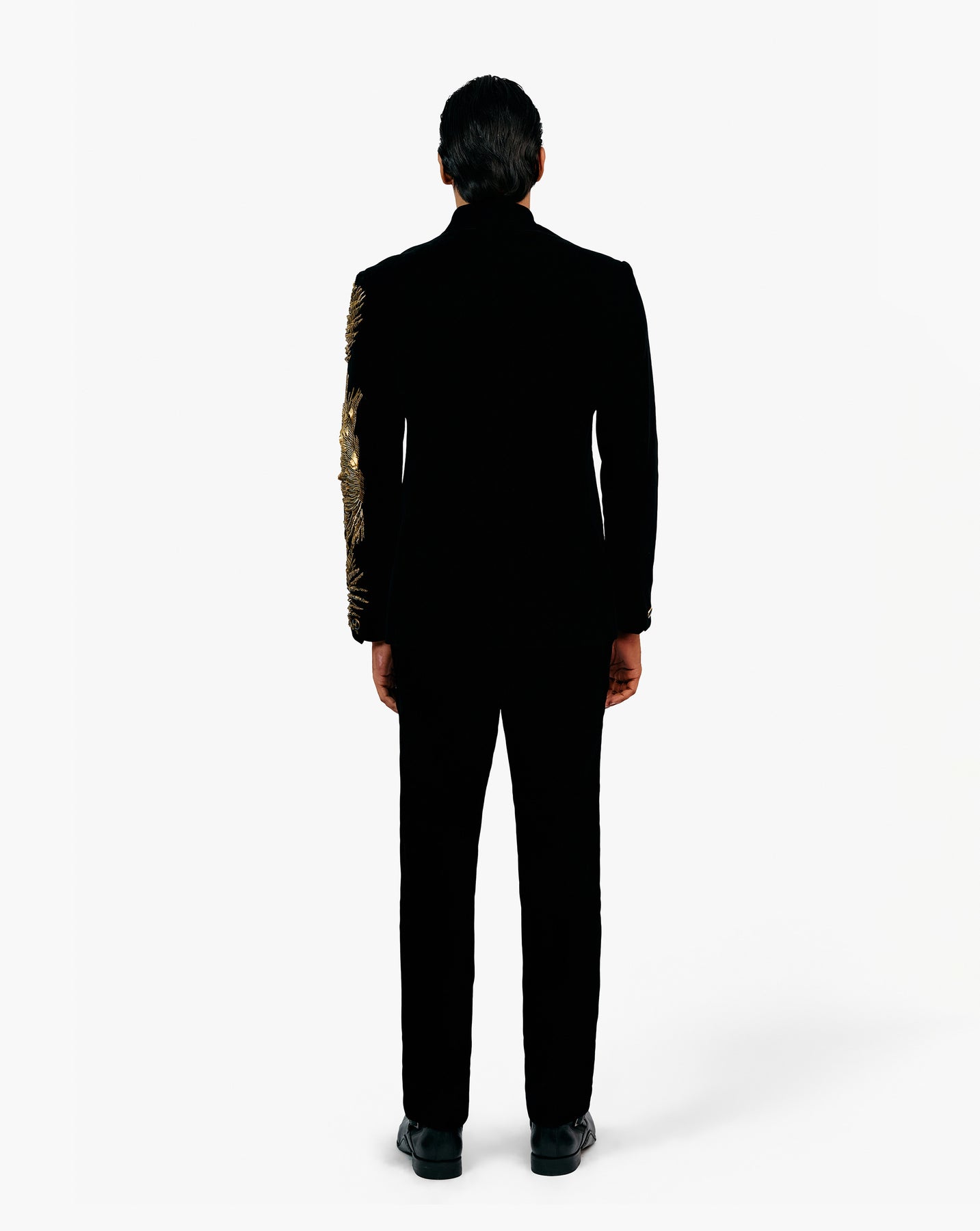 Black velvet straight cut bandhgala with anatomical 3D gold embroidery.