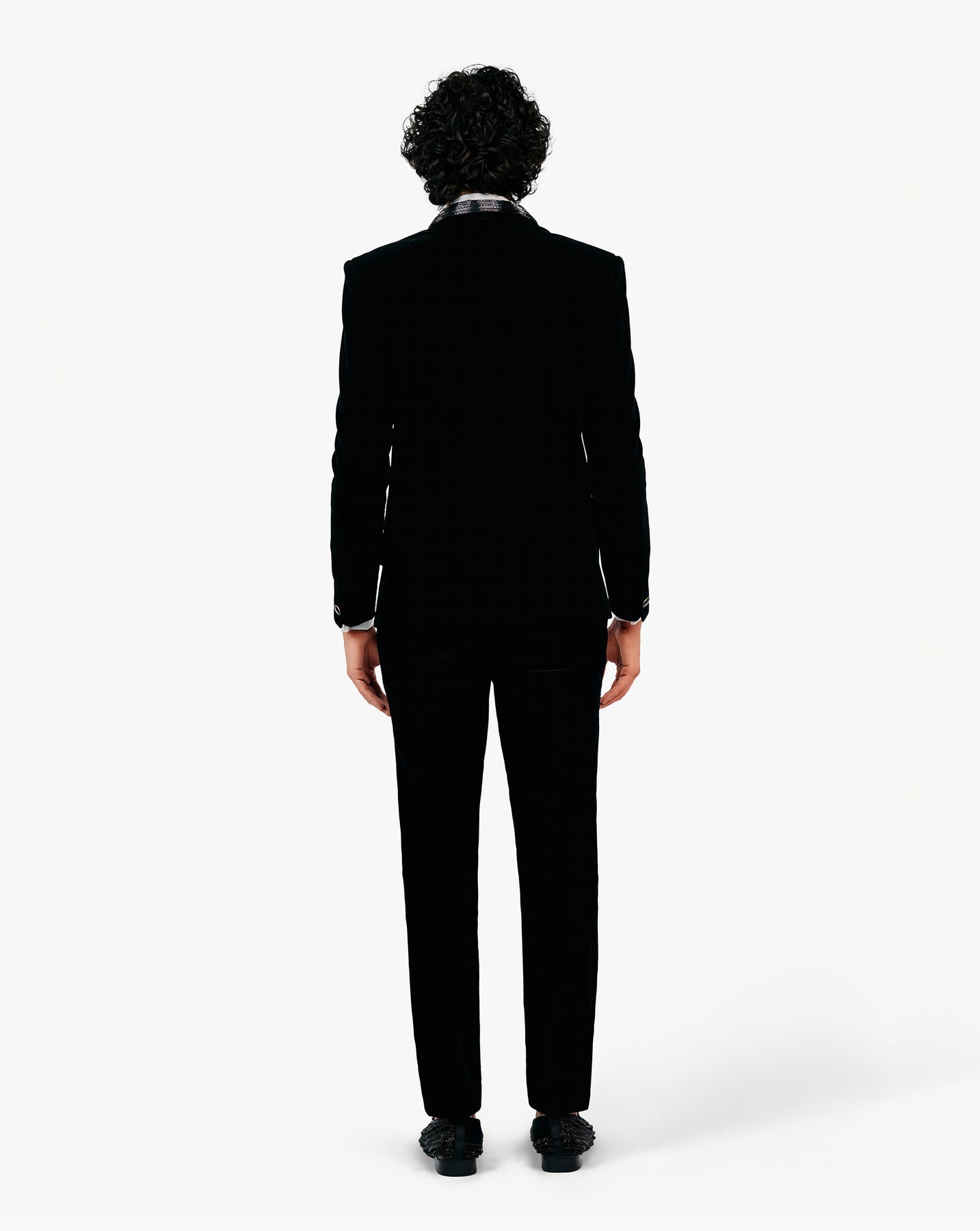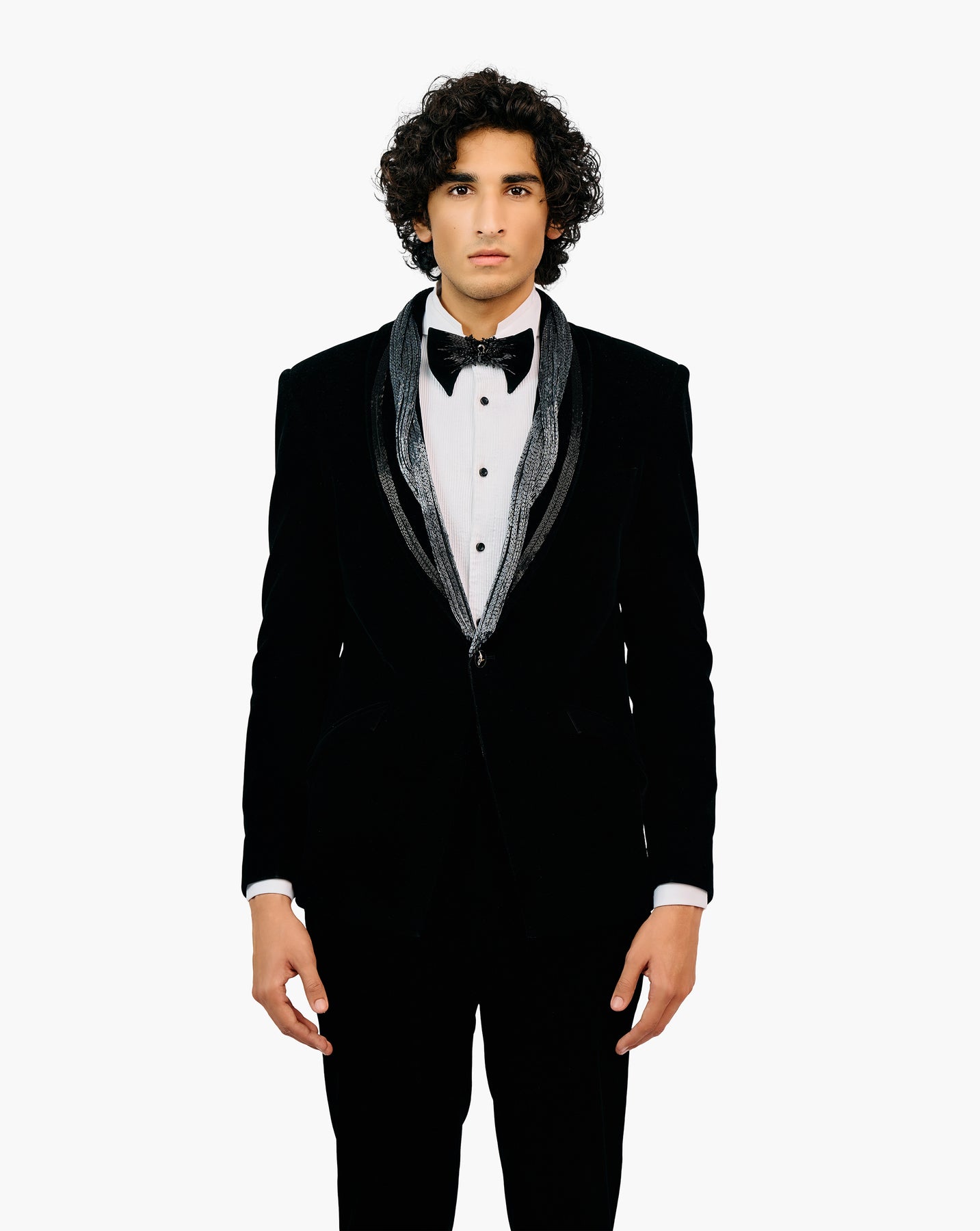 Black velvet Orbit Lapel tuxedo with bugle bead contrast sculpting.
