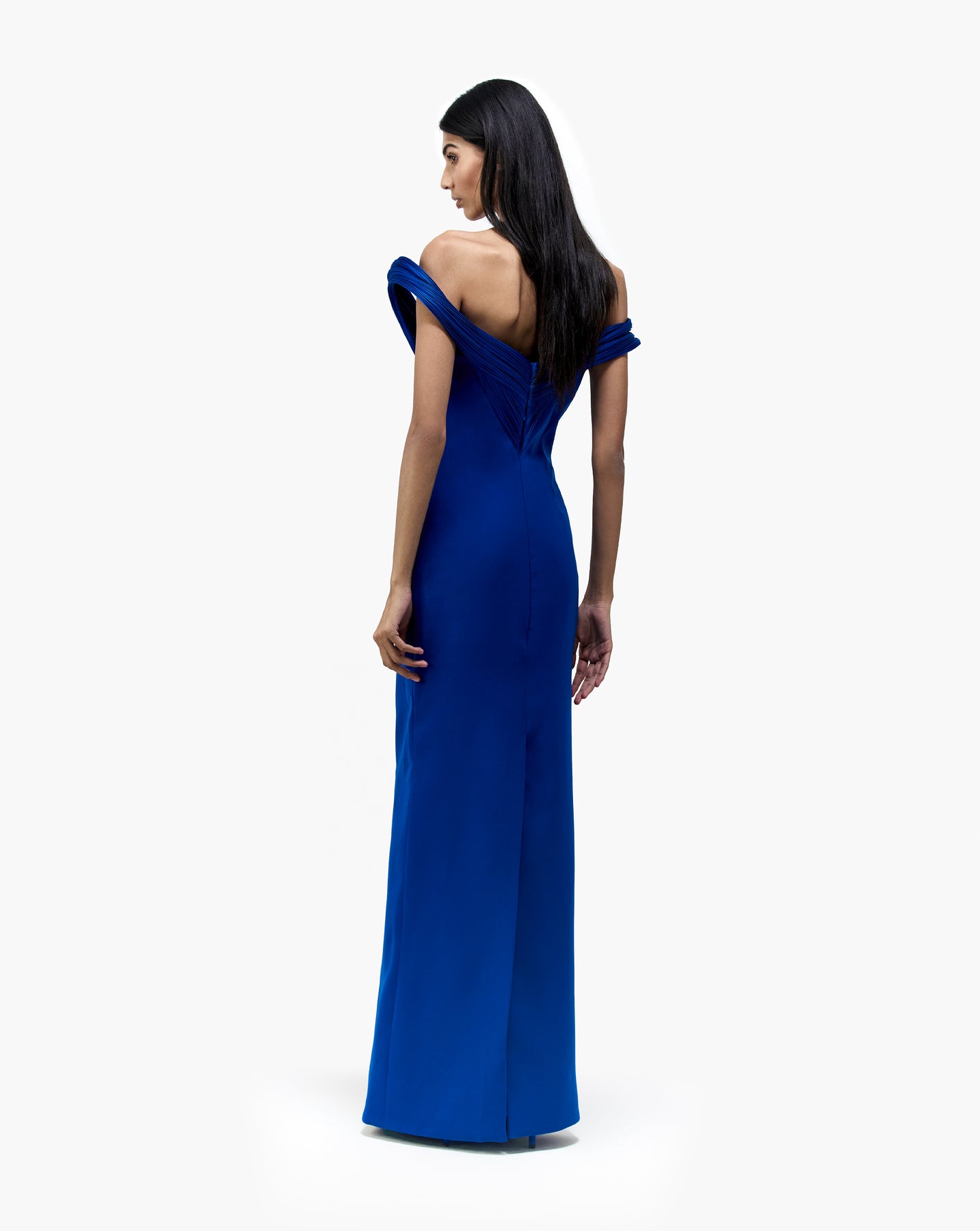 The electrical blue gown with draped sculpted off-shoulder neckline.