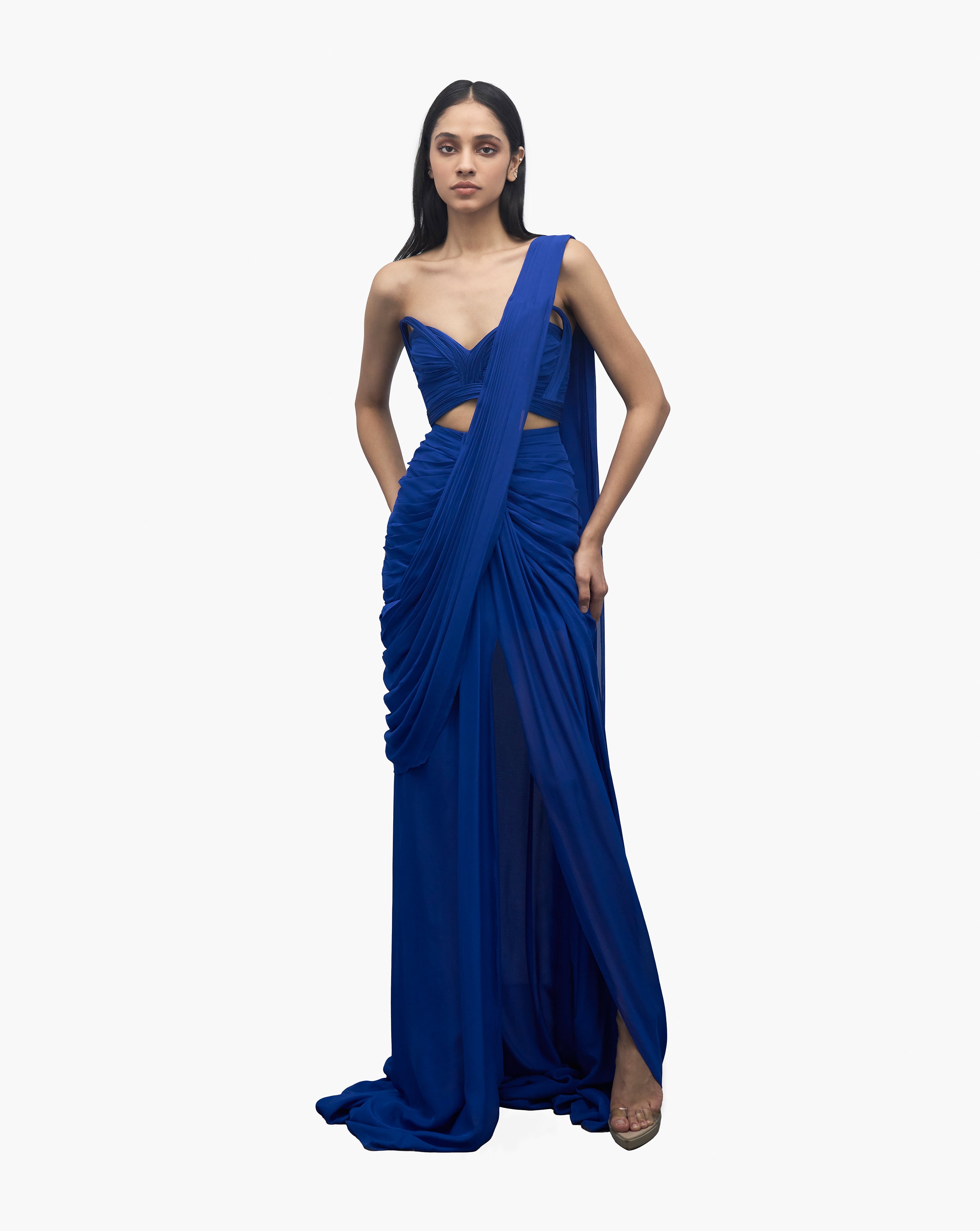 Electric blue saree gown with sculpted detailing.