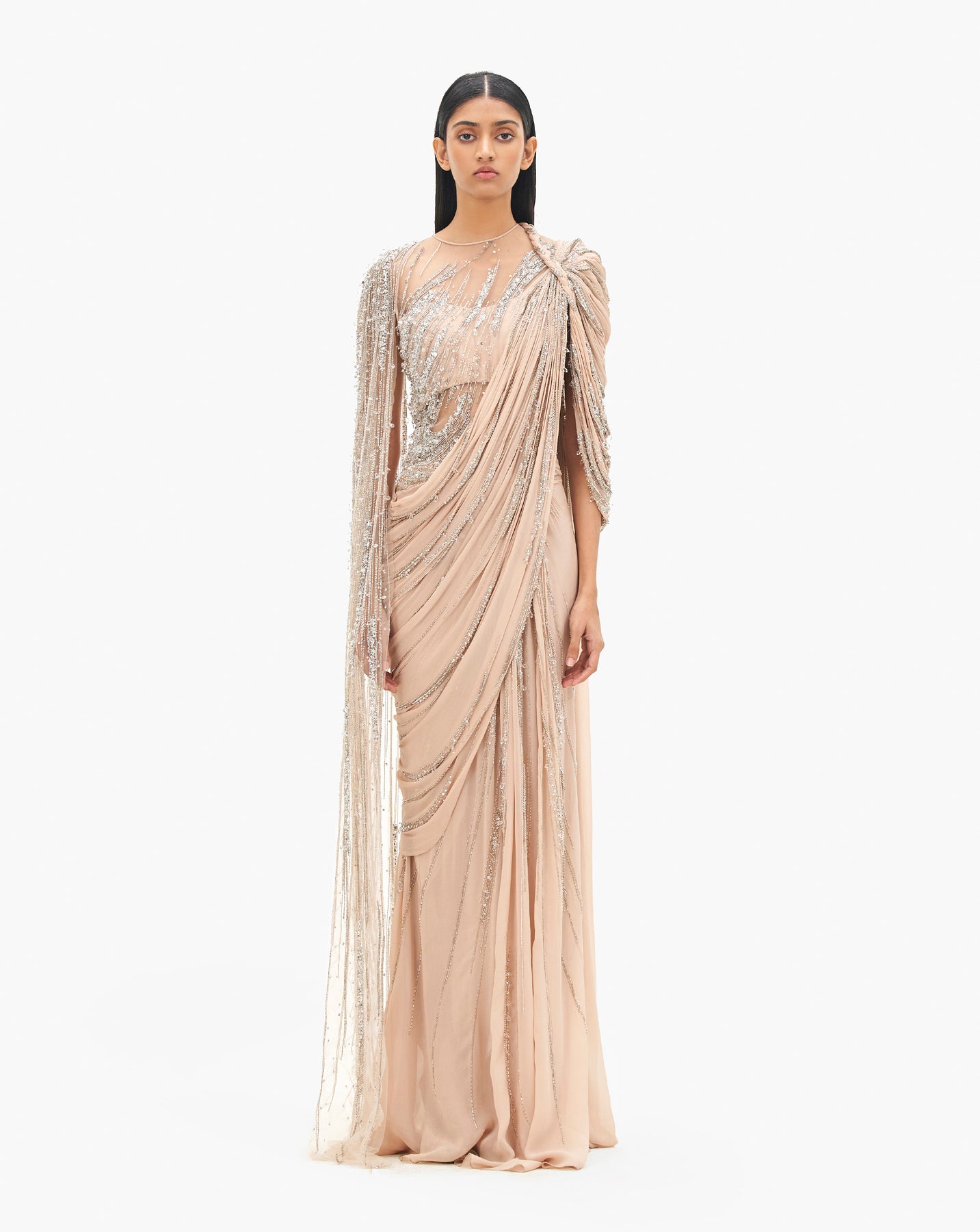 Haze champagne saree gown with intricate embellishments and cape sleeves.