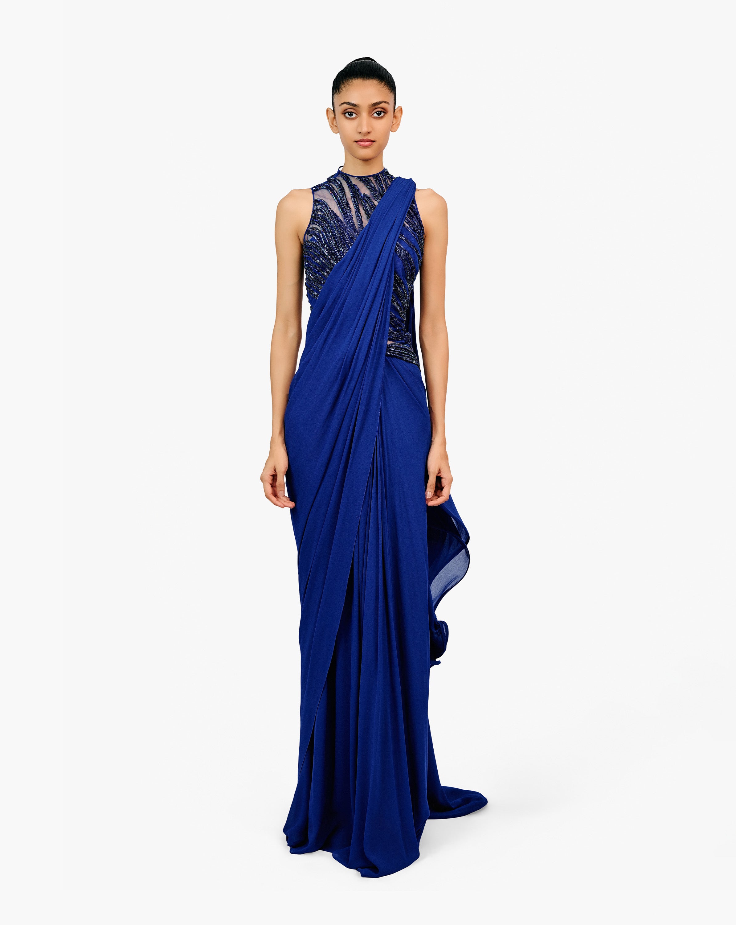 Electric blue saree gown with a regal high neck and intricate buggle bead embellishments.