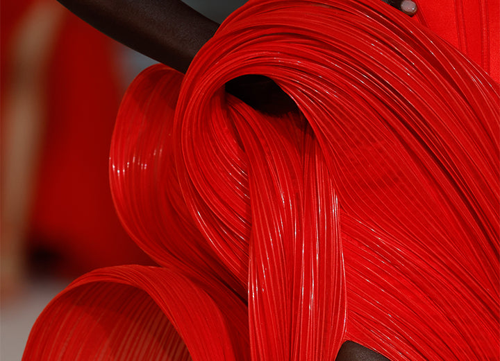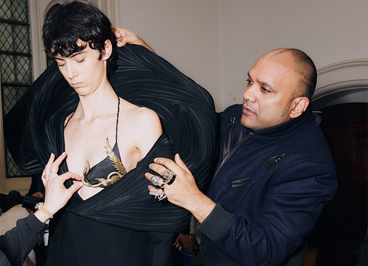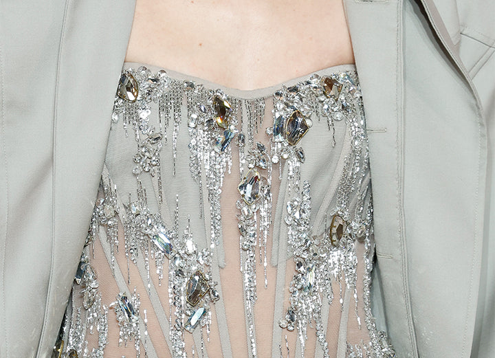 Cropped jackets, exaggerated capes, fluid trench coats and sculpted metal structures come together to paint the surrealism which breathes in ancient Indian texts like the Vedas. Chiffon, woolen suiting’s, tailored textiles are made richer with indigenous techniques like Badla, Mukaish and Zardozi peeping through multi dimensionalcrystals greeting luminescence. The couturier’s signature sculpting art meanders throughout the collection.