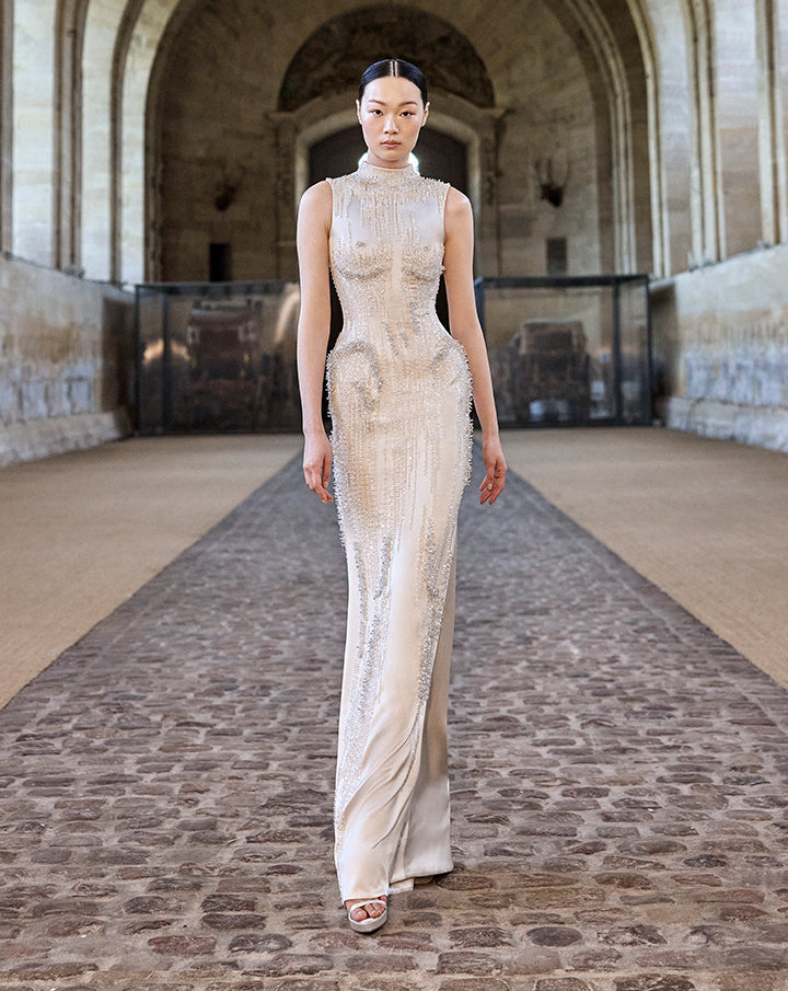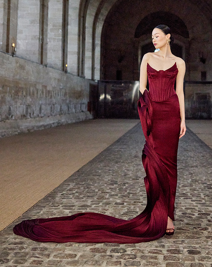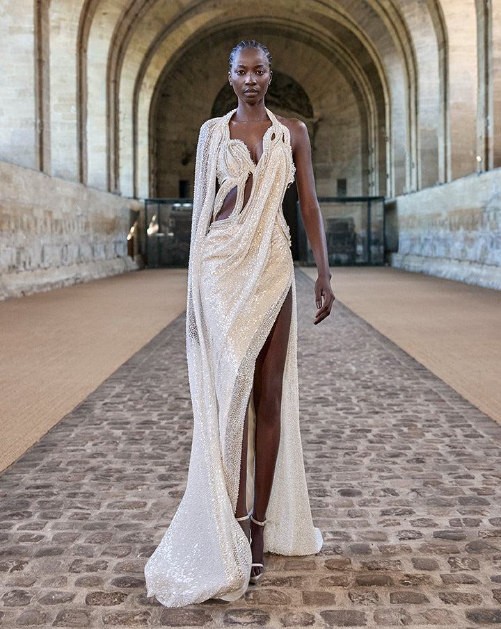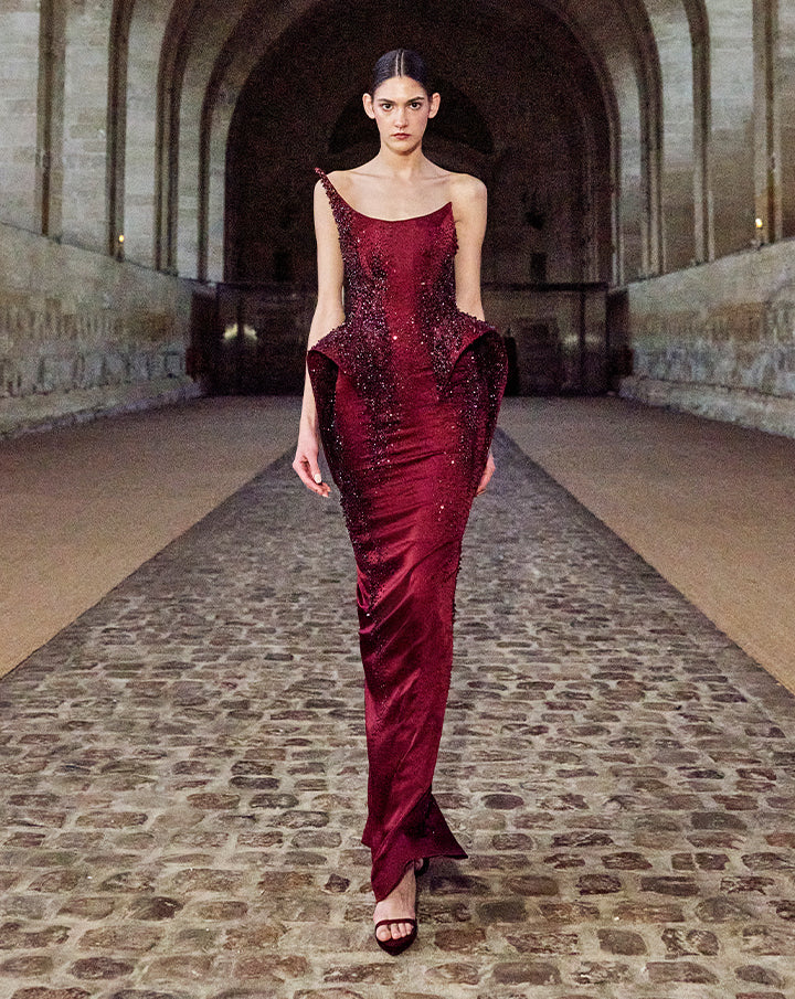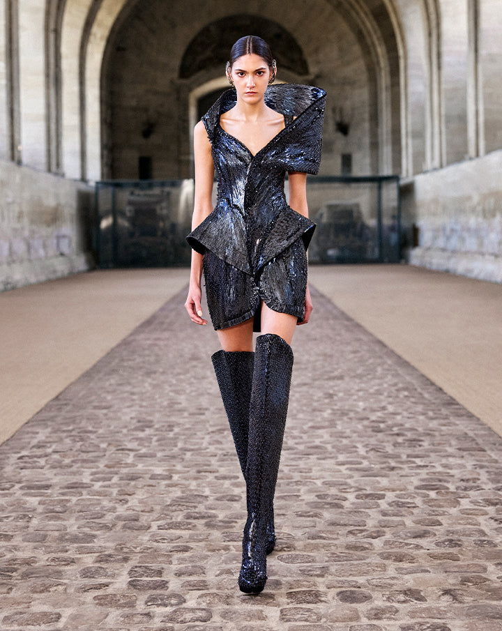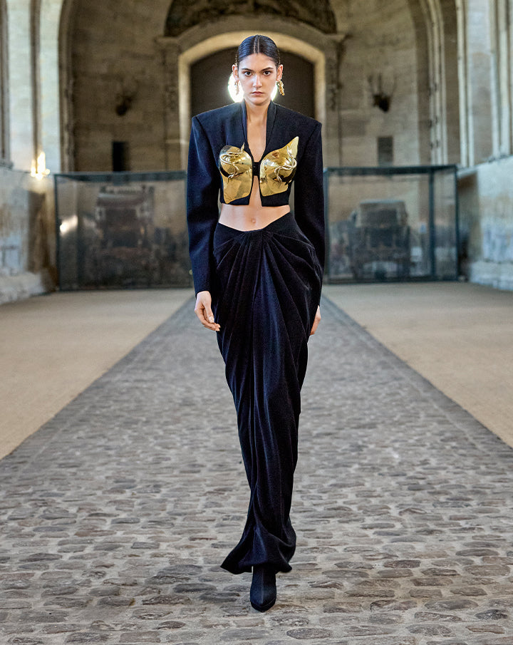 The collection seamlessly blends tradition and innovation, showcasing corsetry, draping, and sculpting techniques. Cropped metal breastplate jackets, saree gowns,