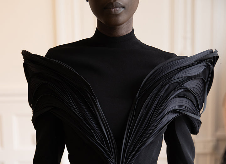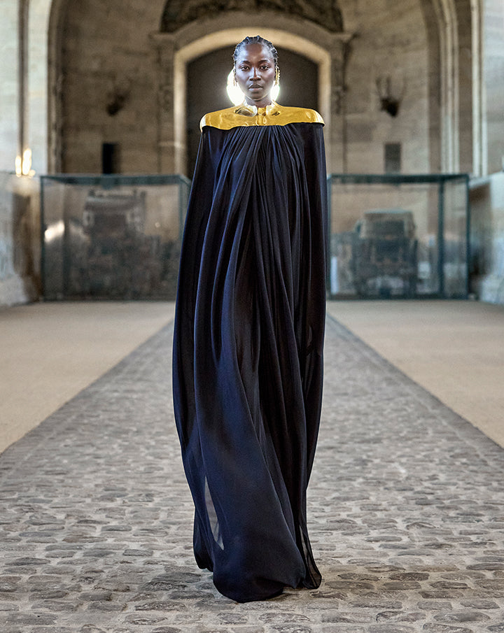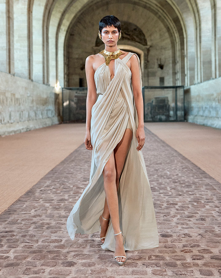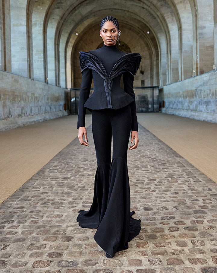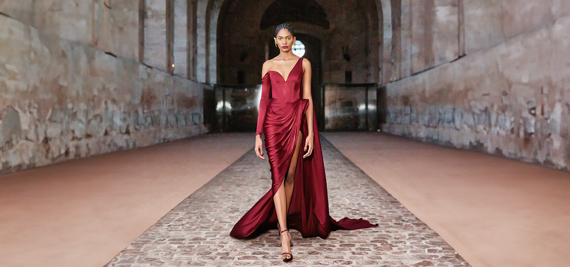 The collection seamlessly blends tradition and innovation, showcasing corsetry, draping, and sculpting techniques. Cropped metal breastplate jackets, saree gowns,