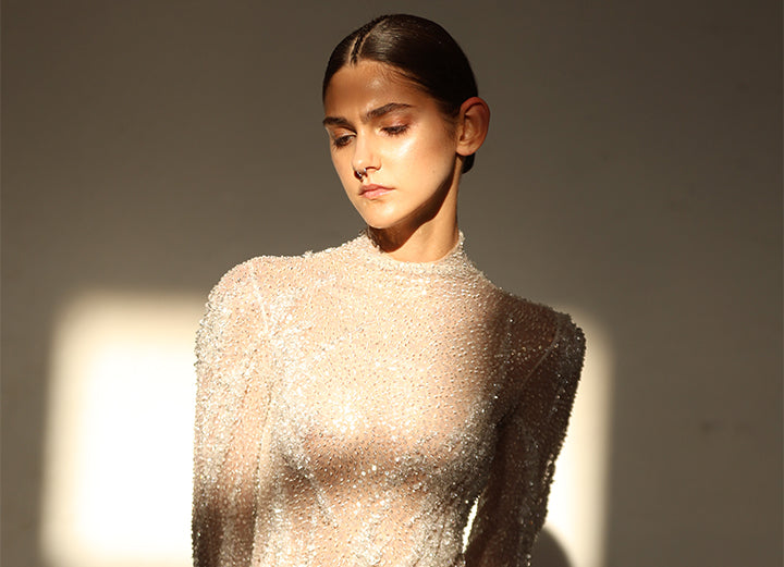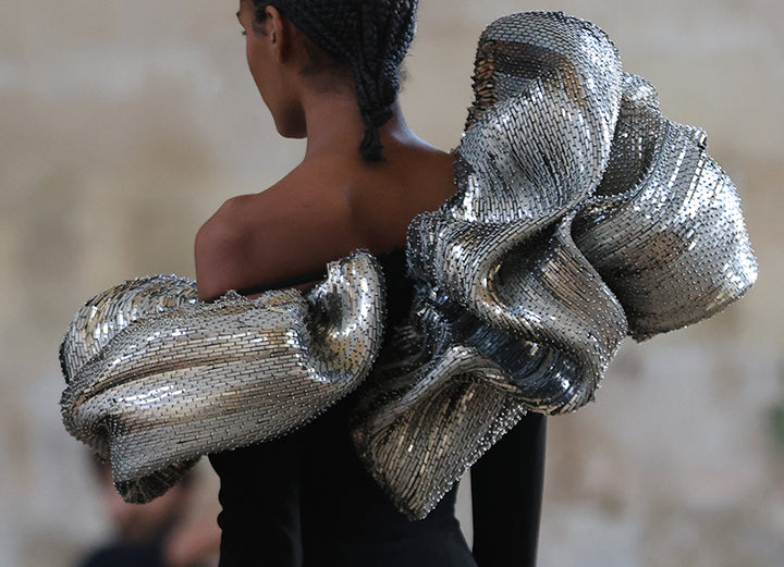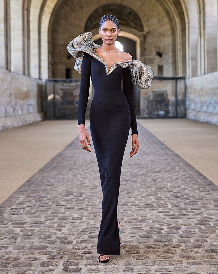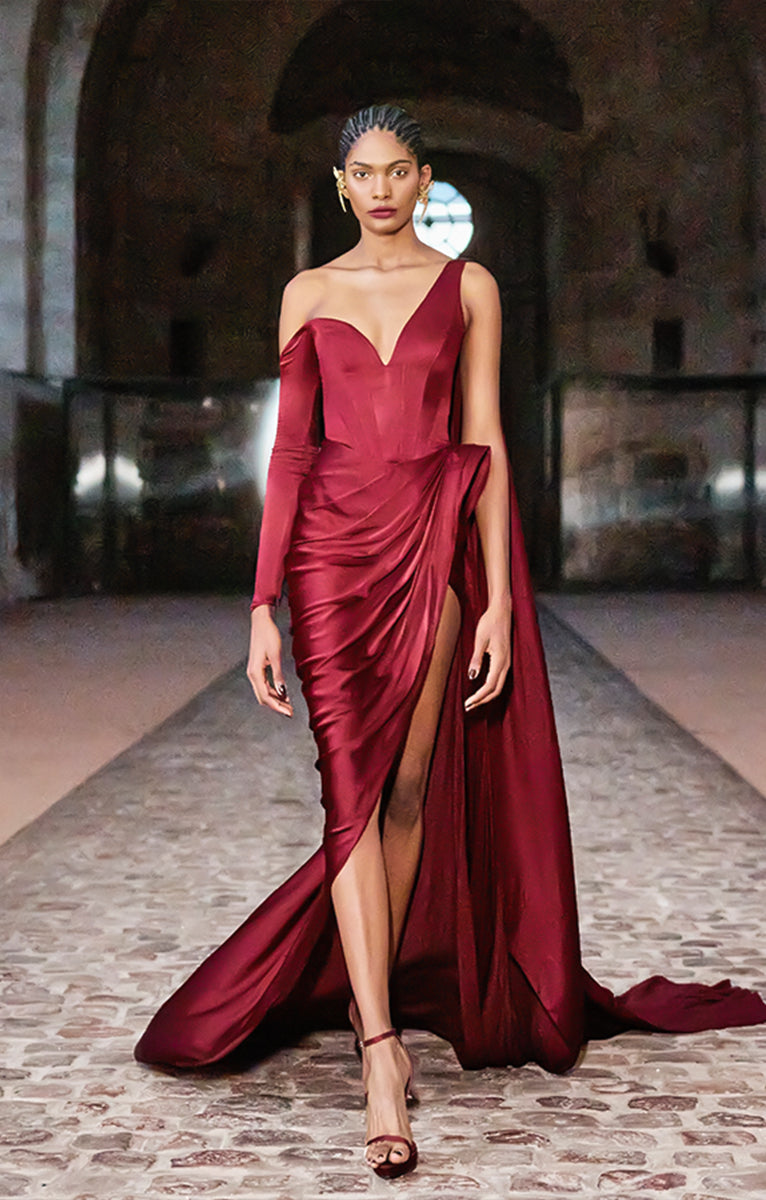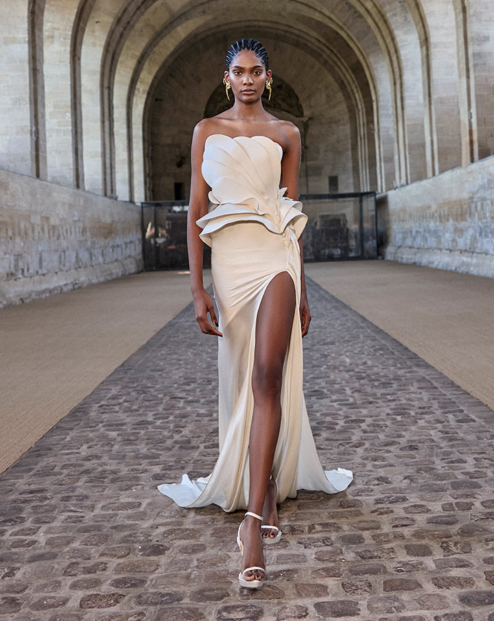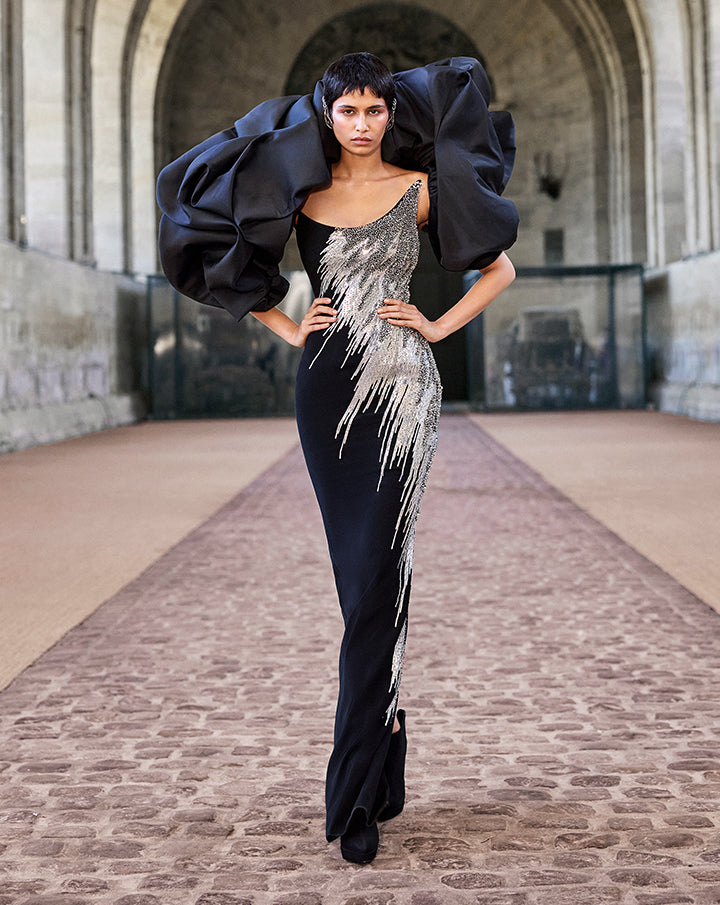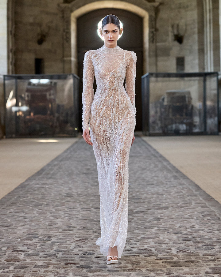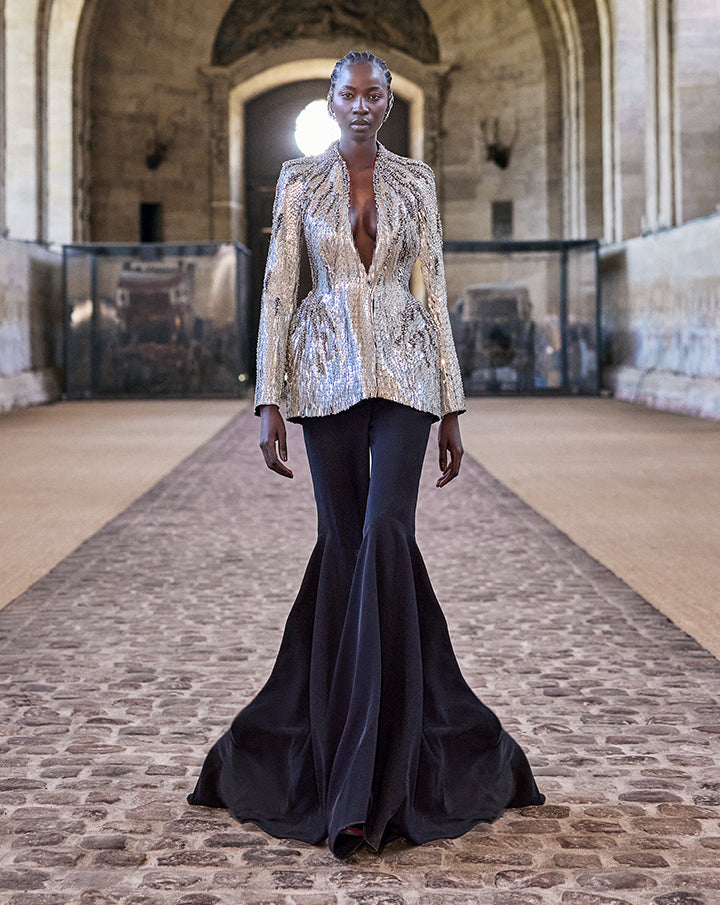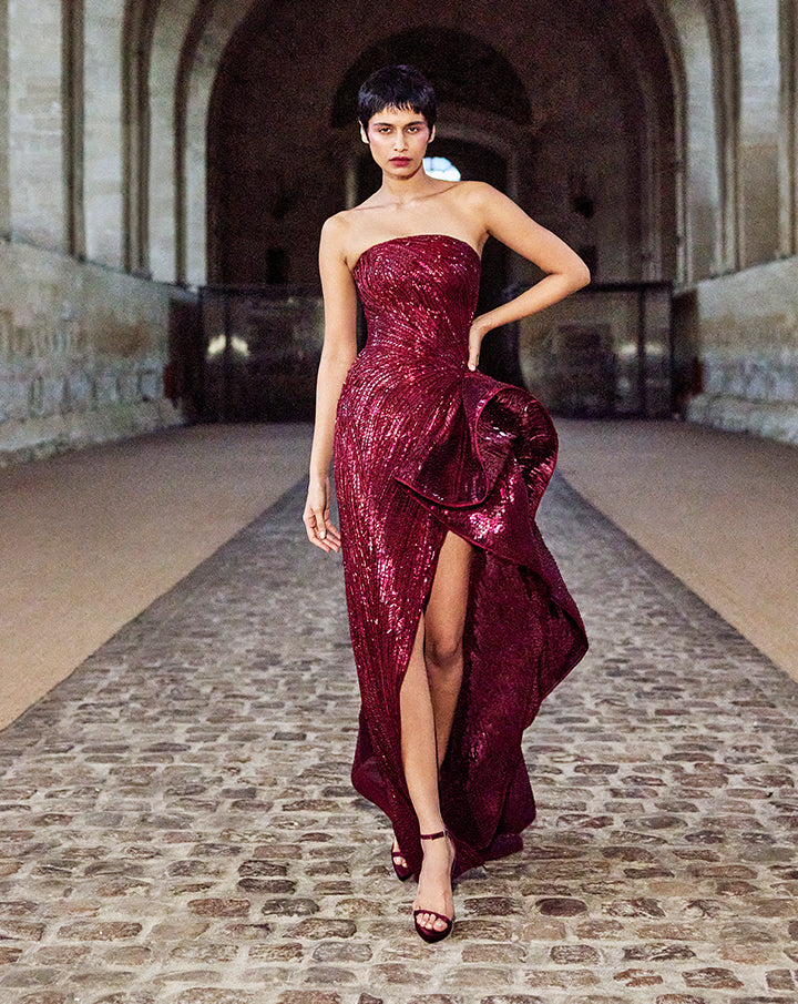exaggerated mini dresses, and newer forms of trousers, including our version of Sharara trousers, come together in this season. The ancient Aari embroidery technique, with its infinity loops and hooked needle, often incorporates Zari Zardosi embroidery, using metallic threads to add shine to the finished piece. The couturier’s signature sculpting art meanders throughout the collection.