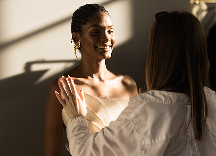 The collection unveils the colors from darkness to light. Moonstone Ivory embodies celestial light. Sand represents light and reflection. Bordeaux, a new addition, embodies richness and depth, akin to the unfolding layers of enlightenment. Black represents the abyss from which illumination emerges. Metallic hues reflect the transcendence into a realm of radiance. Monochrome signifies the harmony found in the union of contrasts. Each shade resonates with the journey from shadow to inner light.