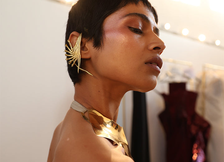 Gaja ear cuff come together to complete the collection. The Mudra ear cuff, the Bahu Mudra ear cuff and the Chakra Choker, designed all in brass, showcase couturier’s