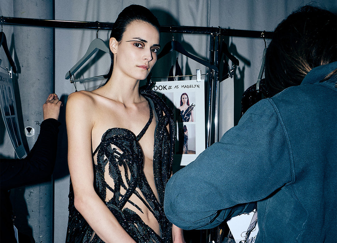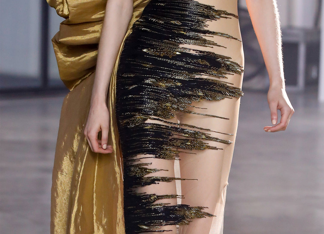 There are elemental dresses in black and nude strategically revealing the form in its pristine state. Meteoric light embroideries emulate melting lava or deep waves of a very dark ocean. There is also a garbage like dress with abstract entangled wires as embroideries. There is a snake dress slithering and intertwining all through the body. The snakes, inspired by the kundalini, softly meander on the body in hand-embroidered waves.