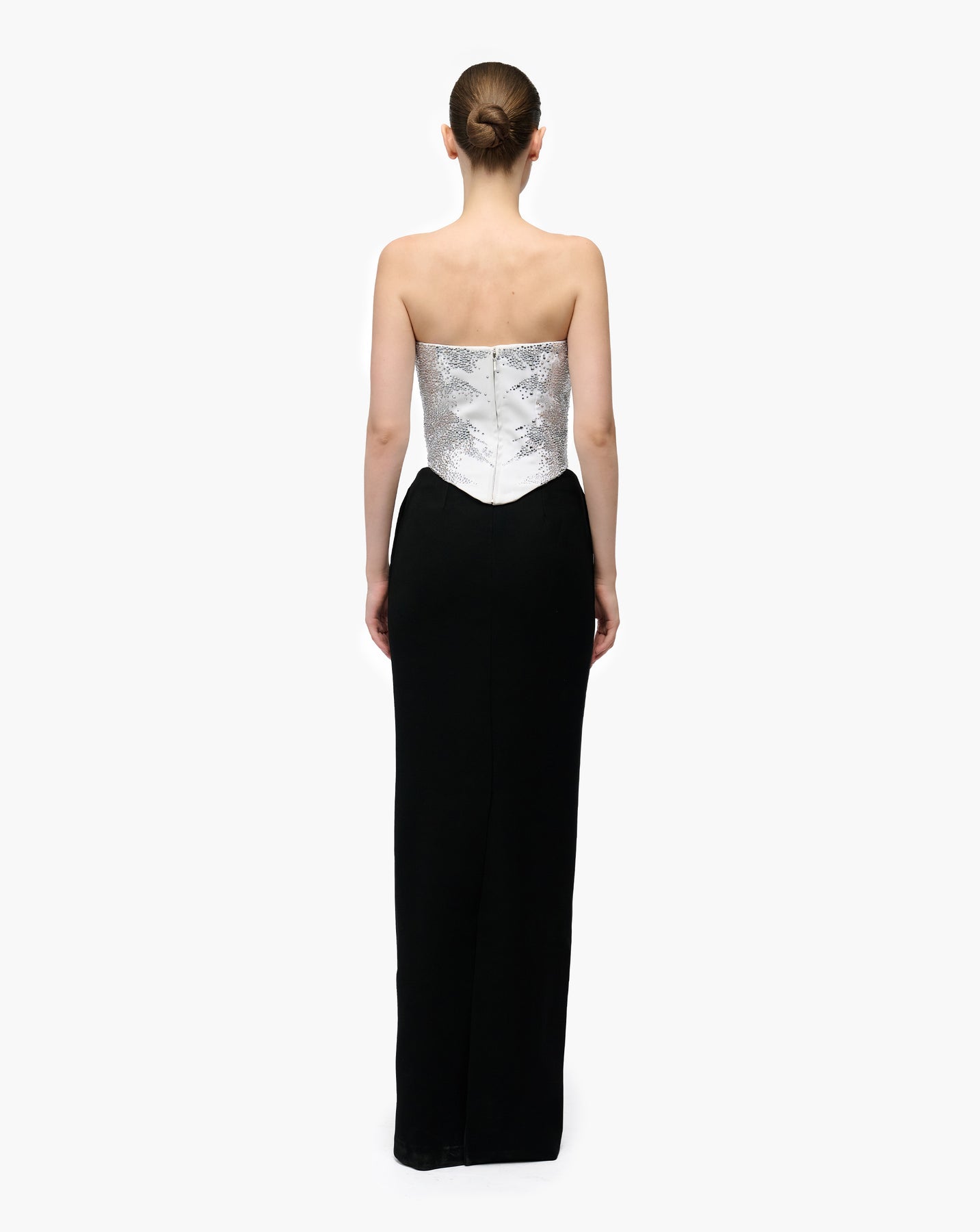 White corset top with anatomical crystal embroidery, paired with a black column longline skirt.