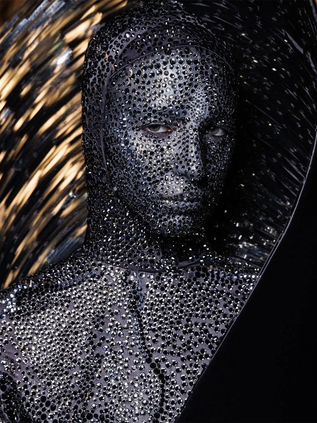 The collection’s otherworldly vision comes alive through makeup by MAC, crafted by lead makeup artist Marieke Thibaut, which incorporates key elements of the collection’s narrative. A celestial third-eye sun is painted on all models, while another face is adorned with Preciosa crystals, creating a radiant effect.