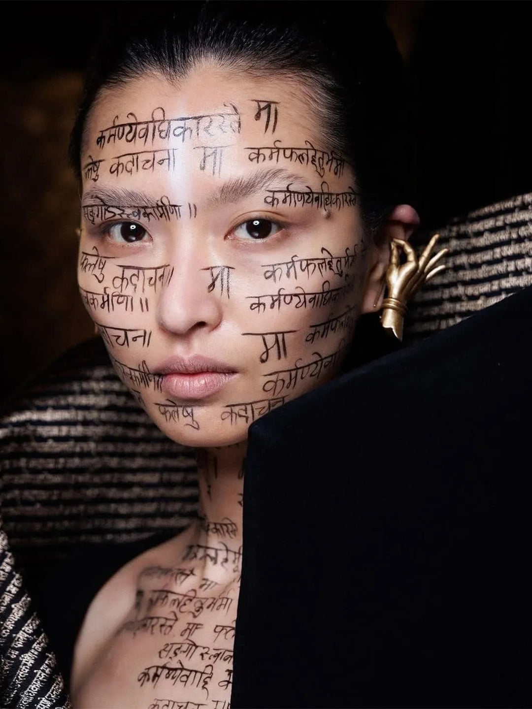 In a powerful visual representation of their cosmic journey, a blue face appears, symbolizing the ‘Star-seed’, an alien human form that Gaurav and Navkirat encountered on their healing path. The chants woven into the brocade fabrics are reinterpreted by MAC as markings on a model’s face, adding a spiritual and meditative dimension to the storytelling.