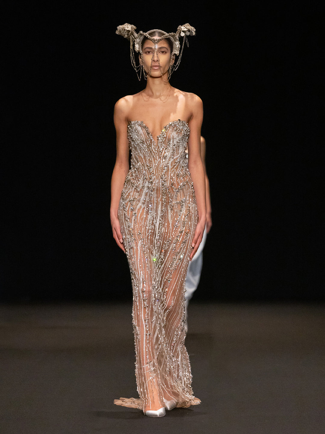 Rooted in hours of meticulous craftsmanship, the collection is a sensory and emotional experience, sculpted through couture. From the first sketch to the final fitting, each garment is an alchemy of innovation and emotion - where fabric, form, and embellishment speak the language of the cosmos. The exceptional brilliance and clarity of the Preciosa crystals allow the garments to catch and reflect light in transformative ways, evoking a sense of interstellar movement with every step.